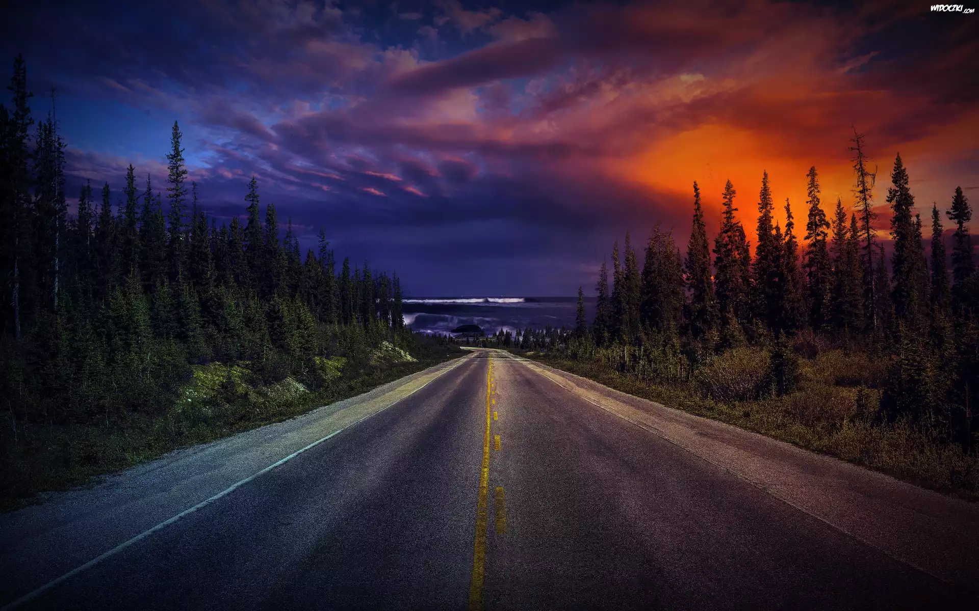 Zdjęcia, Droga, Las, Morze, Zachód słońca