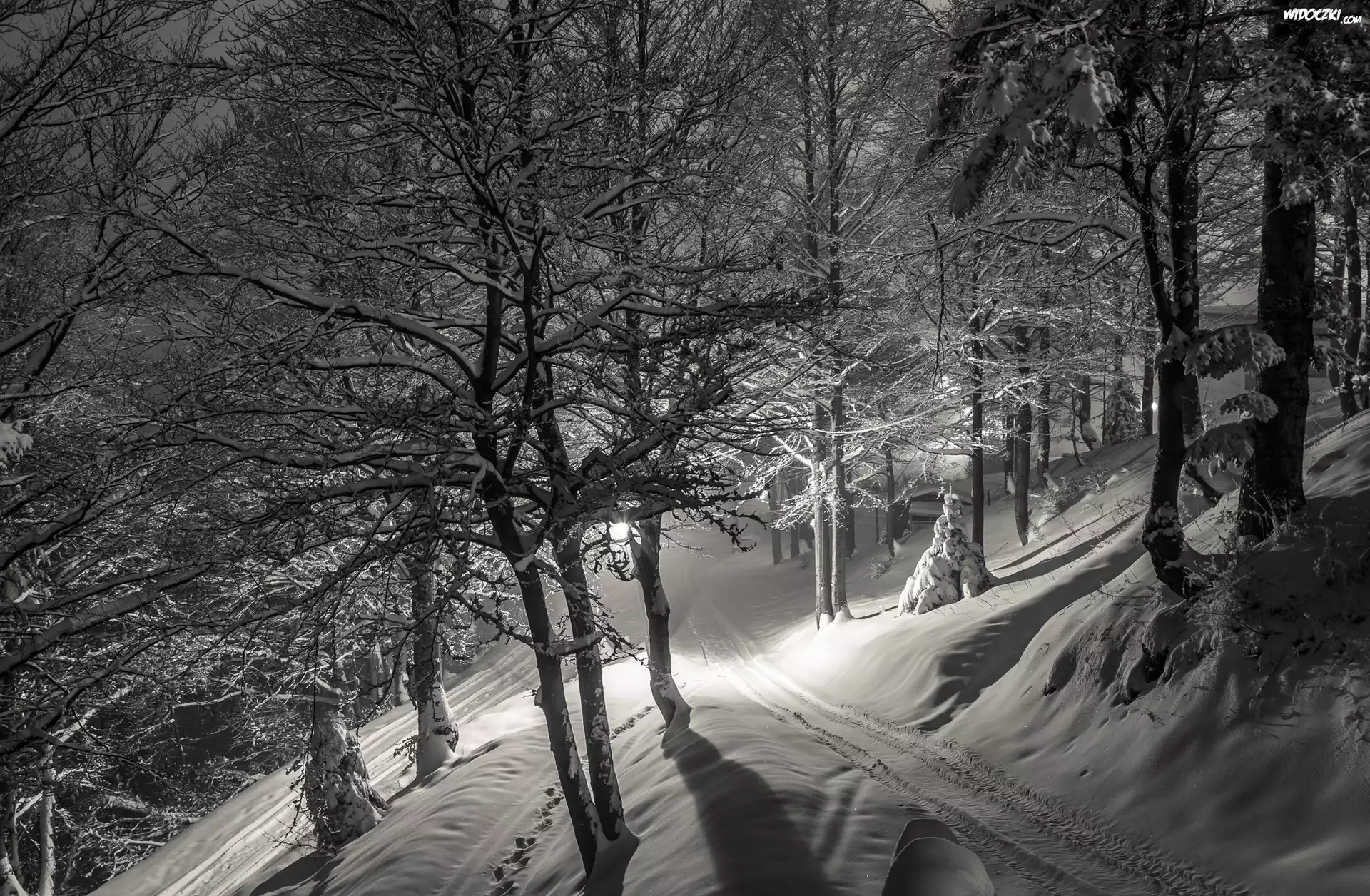Zdjęcia, Zima, Droga, Drzewa, Las, Światło, Czarno-Białe