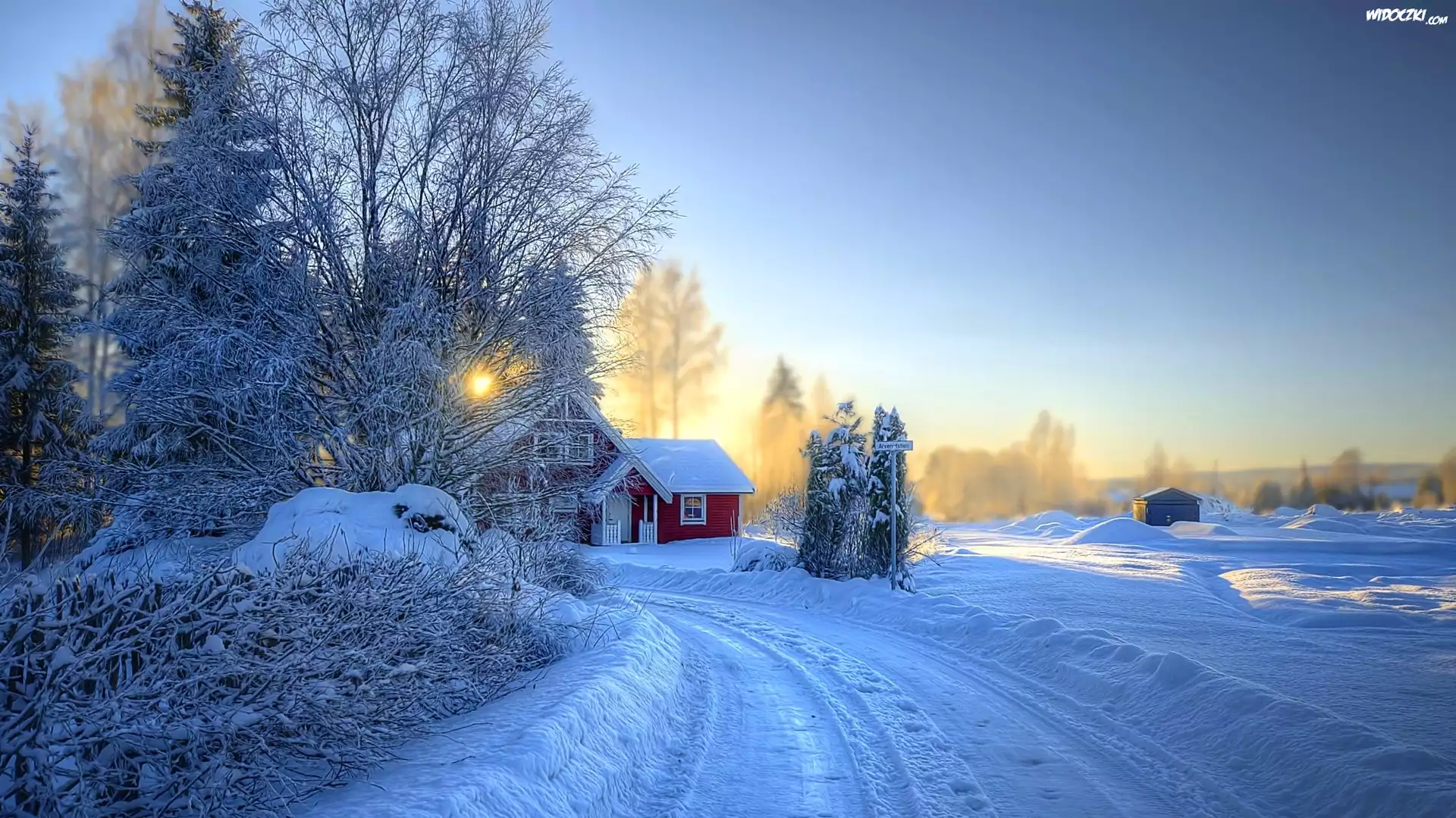 Zdjęcia, Zima, Droga, Dom, Wschód słońca, Pole, Drzewa
