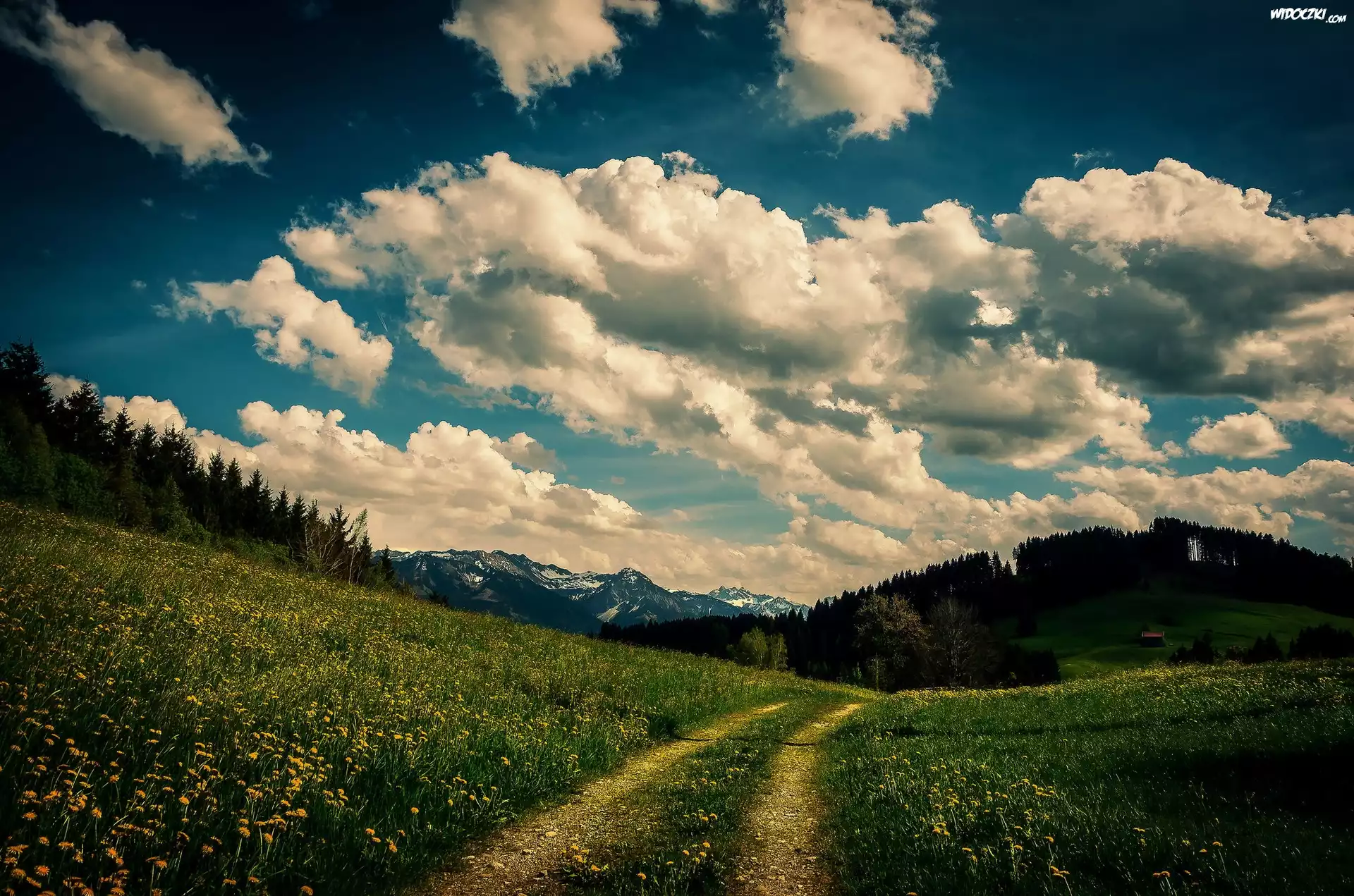 Zdjęcia, Dróżka, Pola, Góry, Chmury, Drzewa