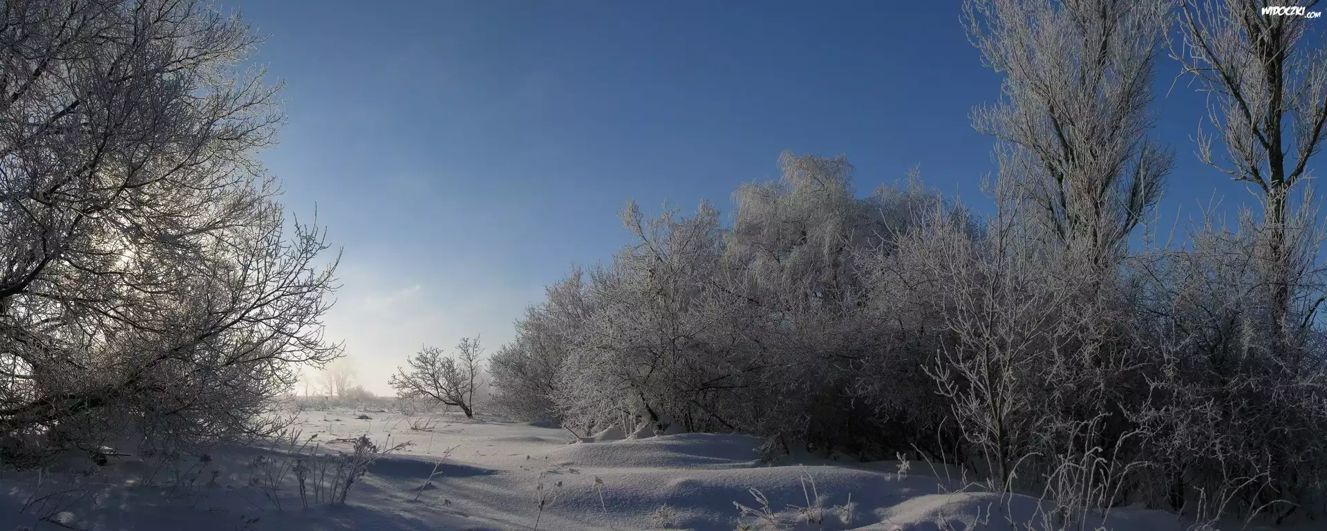Zdjęcia, Drzea, Krzewy, Śnieg, Niebo