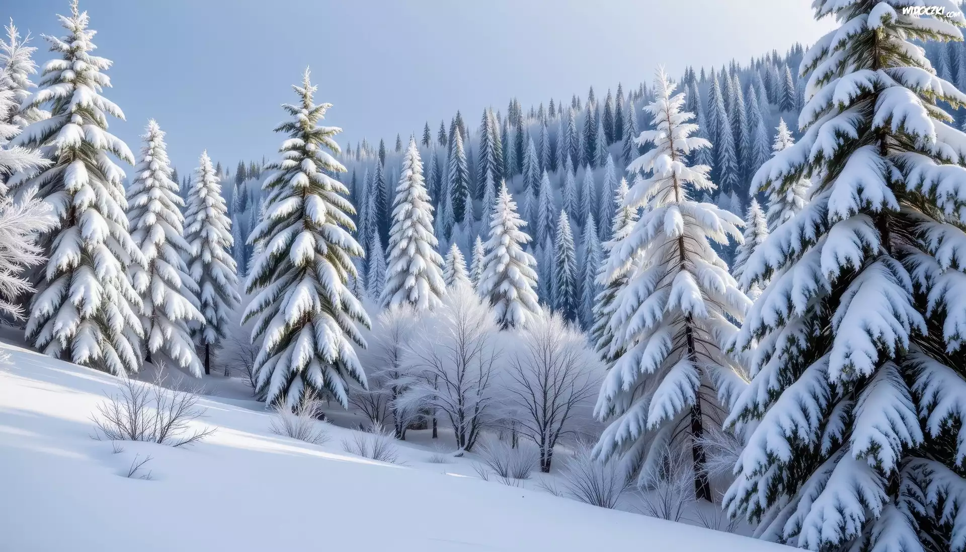 Zdjęcia, Zima, Zbocze, Las, Drzewa, Grafika AI