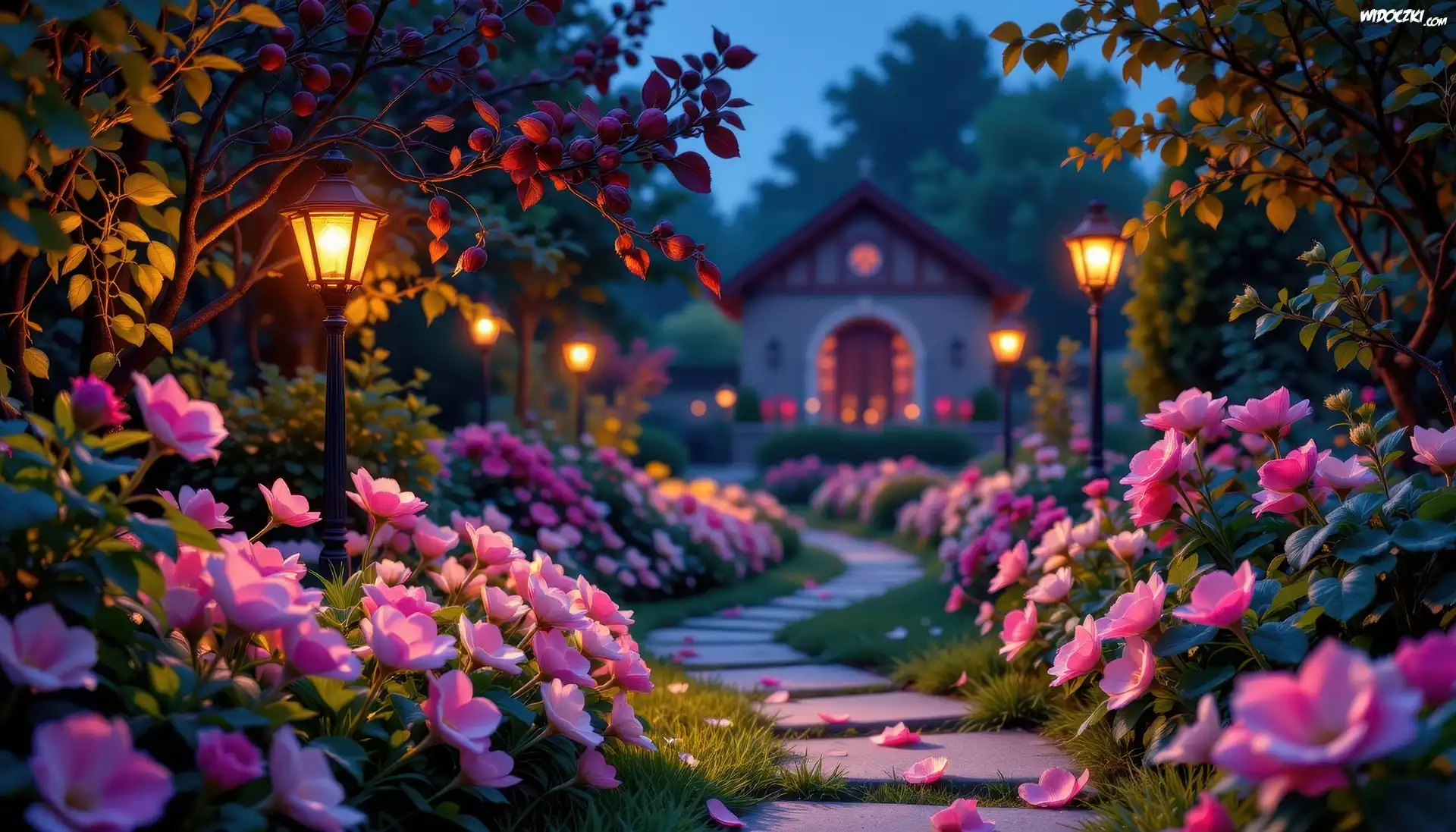 Ogród, Kwiaty, Latarnie, Drzewa, Grafika AI