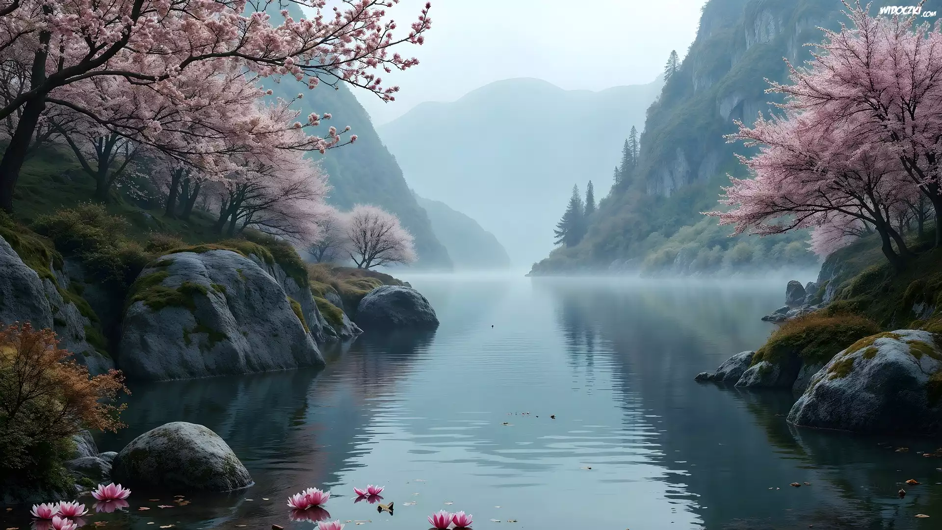 Zdjęcia, Jezioro, Góry, Skały, Drzewa, Wiosna, AI