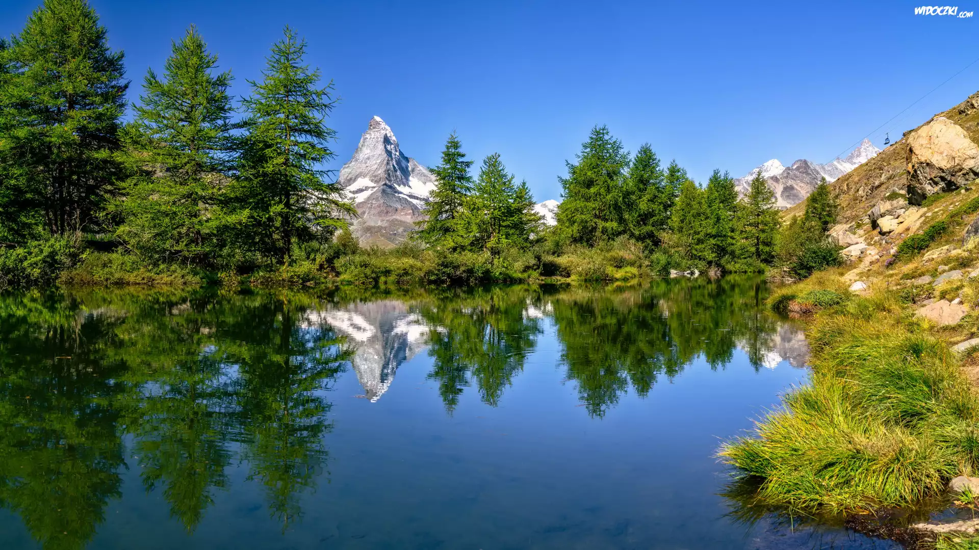 Zdjęcia, Szwajcaria, Góry, Alpy, Szczyt, Matterhorn, Jezioro, Riffelsee, Drzewa