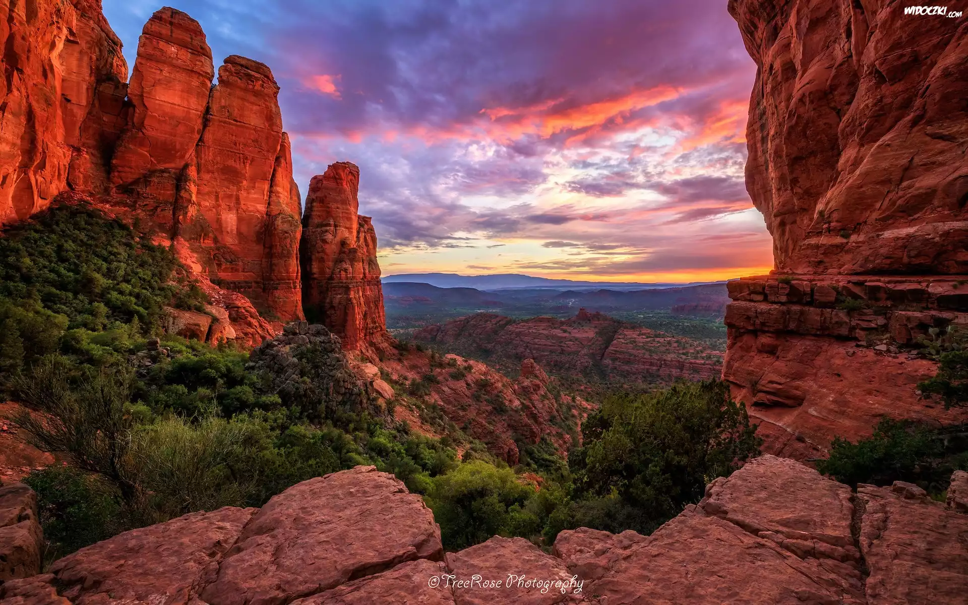 Zdjęcia, Stany Zjednoczone, Arizona, Skały, Sedona, Zachód słońca, Drzewa