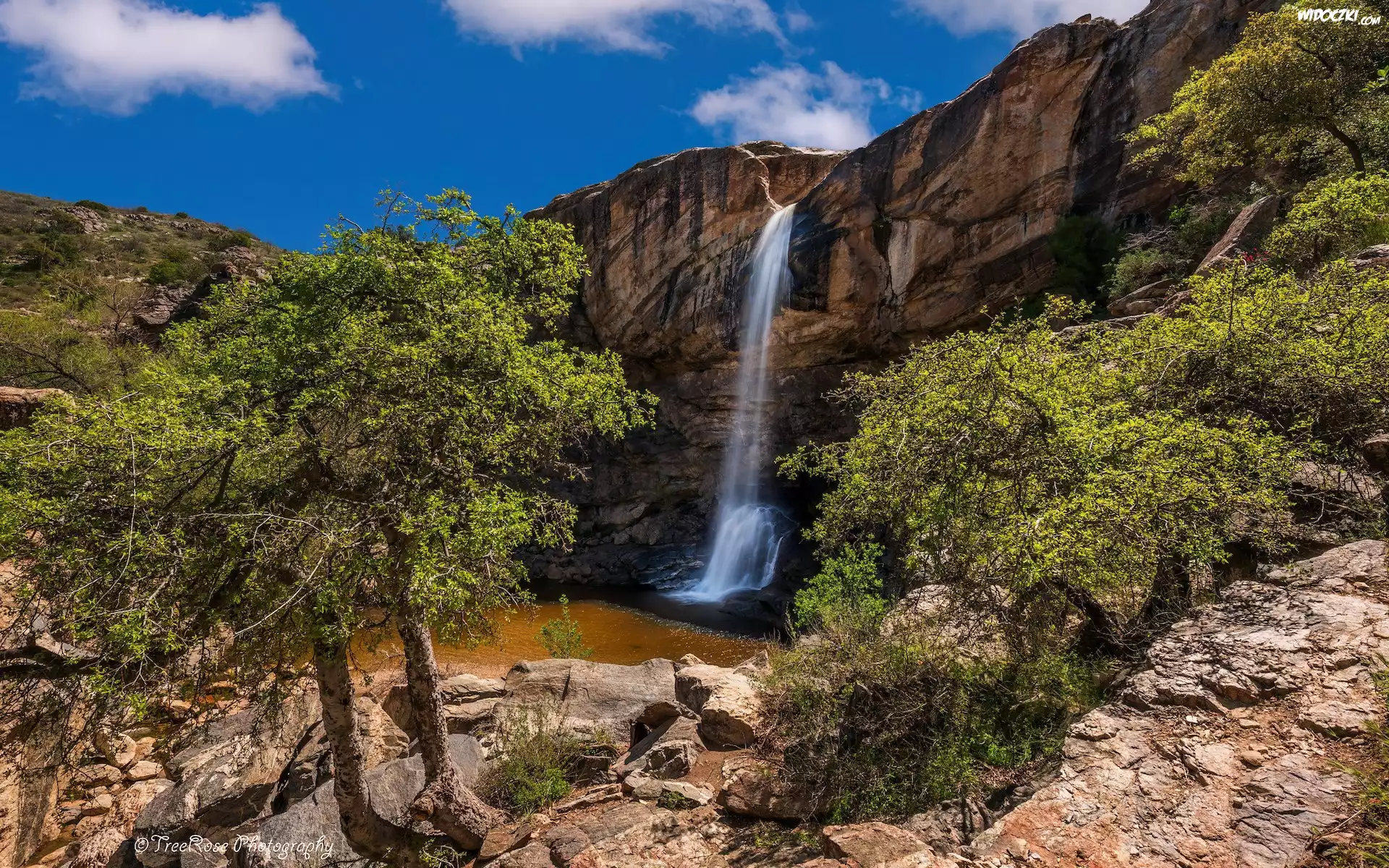 Stany Zjednoczone, Arizona, Skały, Wodospad, Chiva Falls, Drzewa