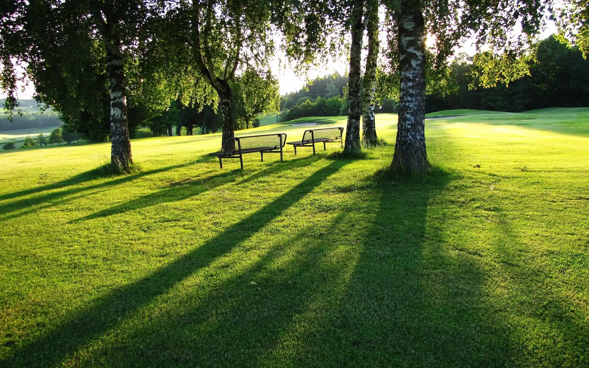 Drzewa, Brzozy, Trawa, Ławeczki, Park
