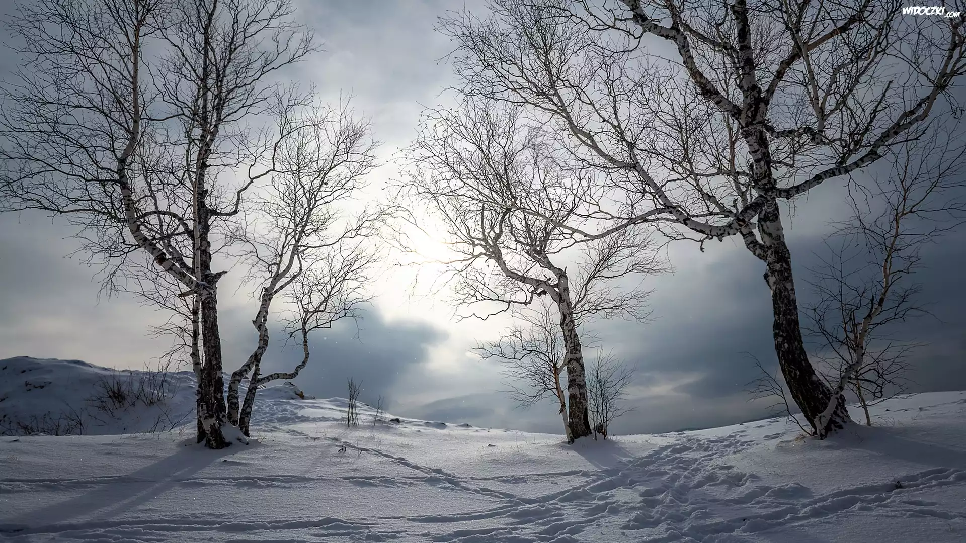 Zdjęcia, Zima, Drzewa, Brzozy, Śnieg, Ślady