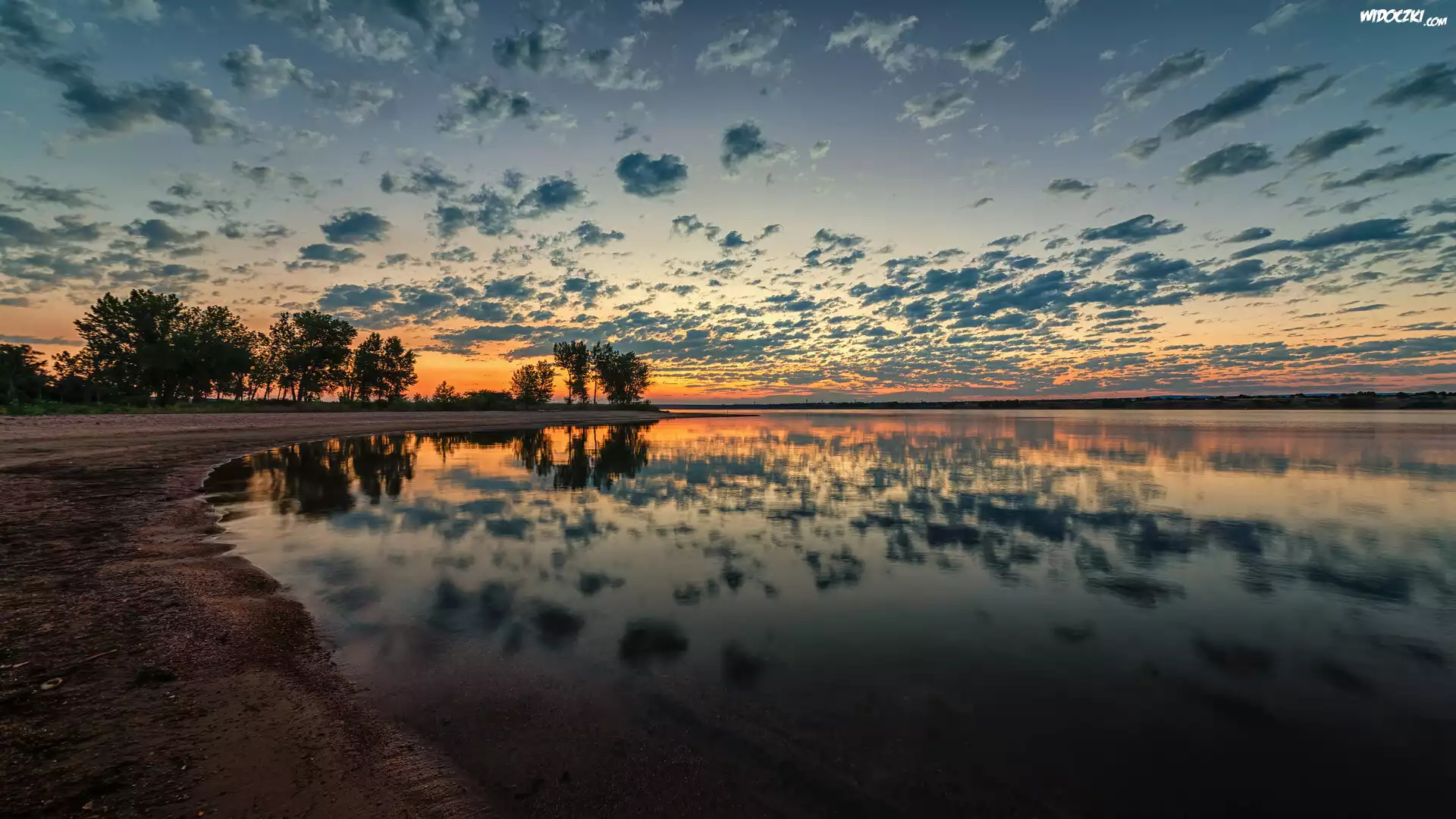 Jezioro, Lake Chatfield, Poranek, Wschód słońca, Drzewa, Chmury, Kolorado, Stany Zjednoczone