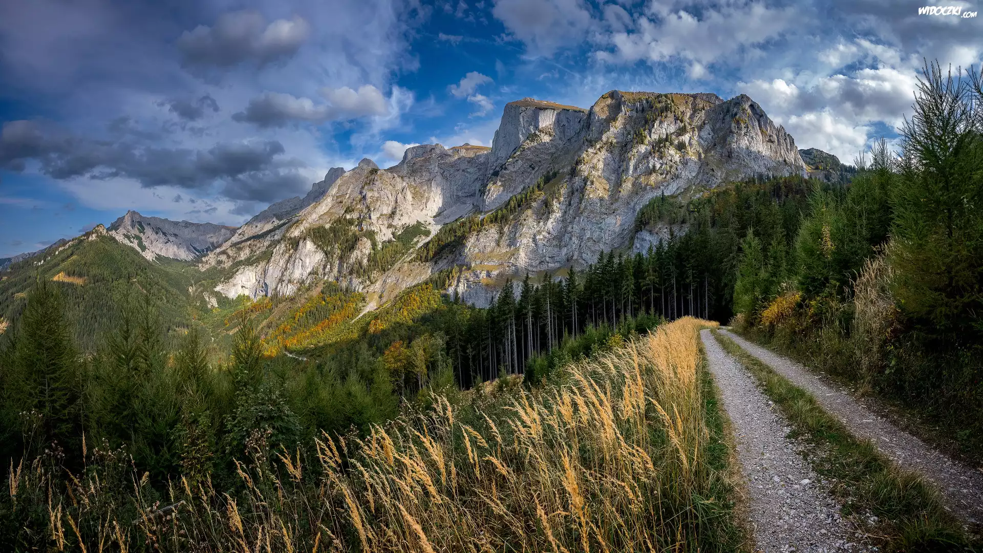 Zdjęcia, Góry, Trawa, Droga, Drzewa, Niebo, Chmury