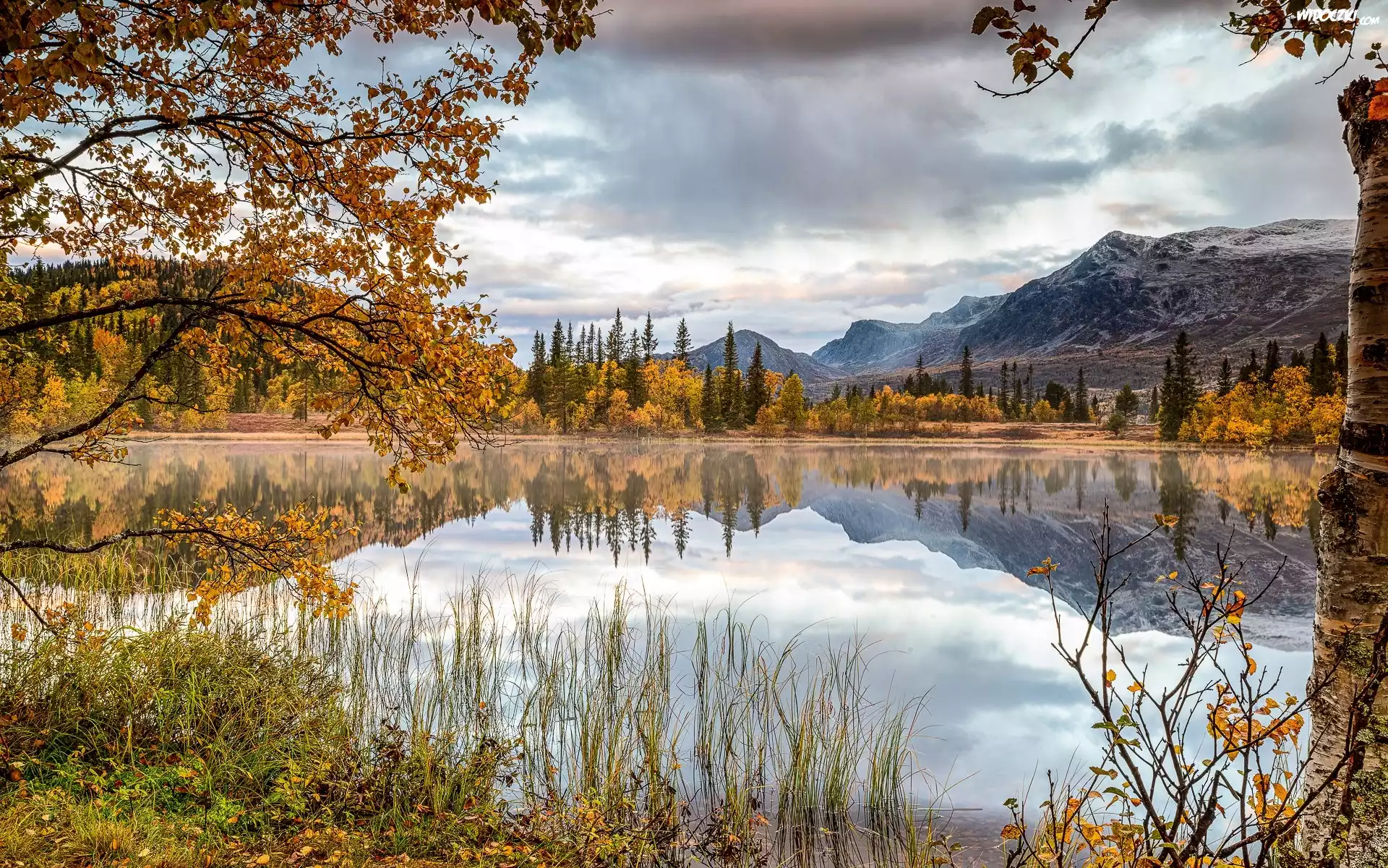 Góry, Odbicie, Jezioro, Drzewa, Jesień, Chmury