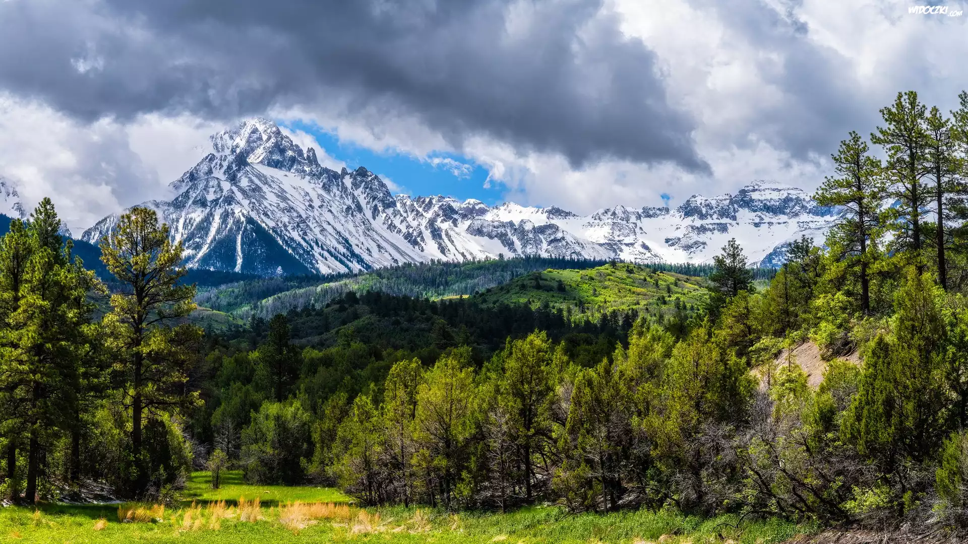 Góry, Śnieg, Lasy, Drzewa, Trawa, Chmury