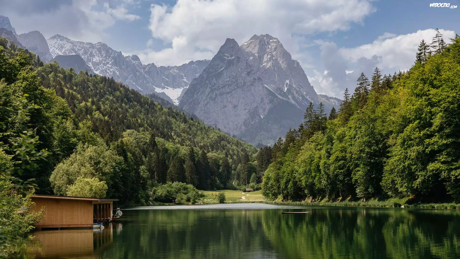 Zdjęcia, Jezioro, Góry, Lasy, Drzewa, Budynek, Chmury