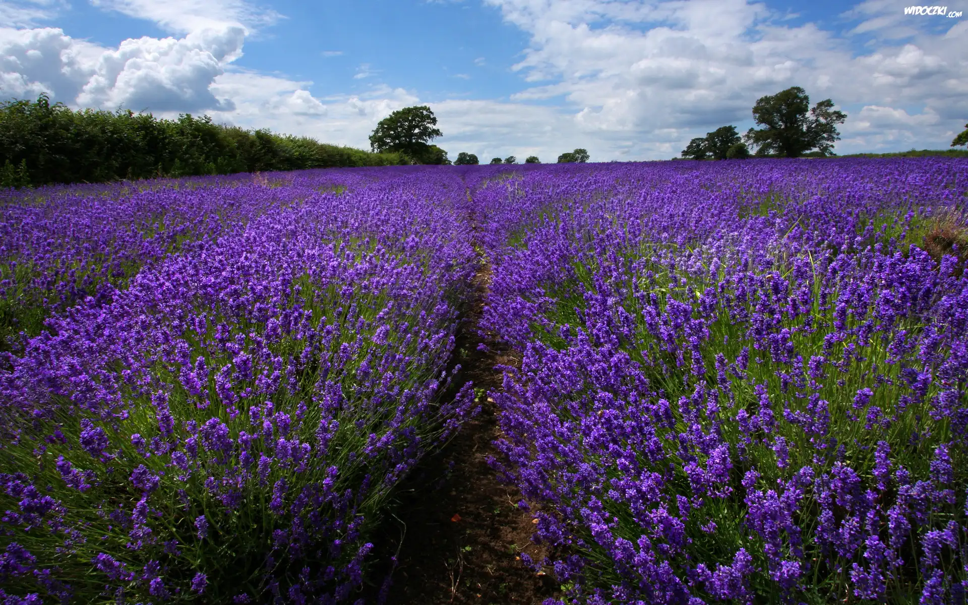 Pole, Lawenda, Plantacja, Drzewa, Niebo, Chmury