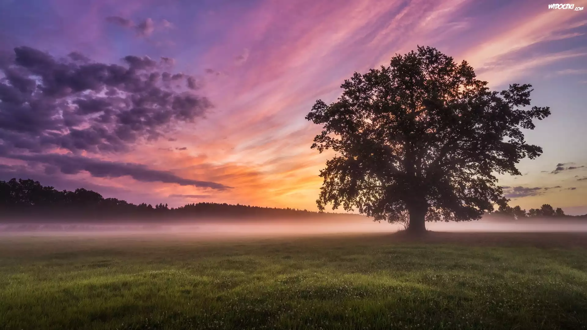 Pole, Drzewa, Mgła, Zachód słońca, Kolorowe, Niebo, Chmury