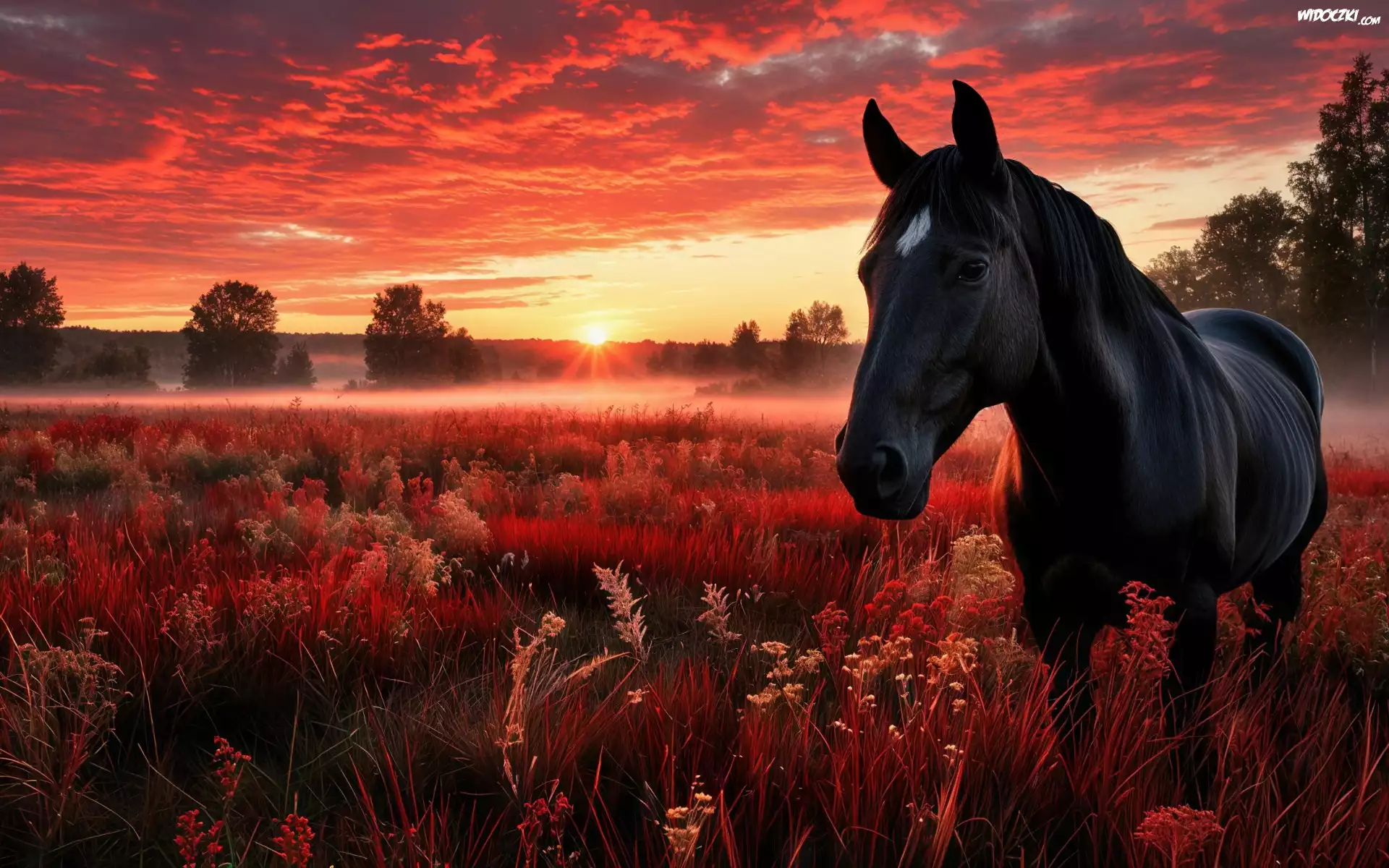 Zachód słońca, Chmury, Łąka, Koń, Trawa, Mgła, Drzewa
