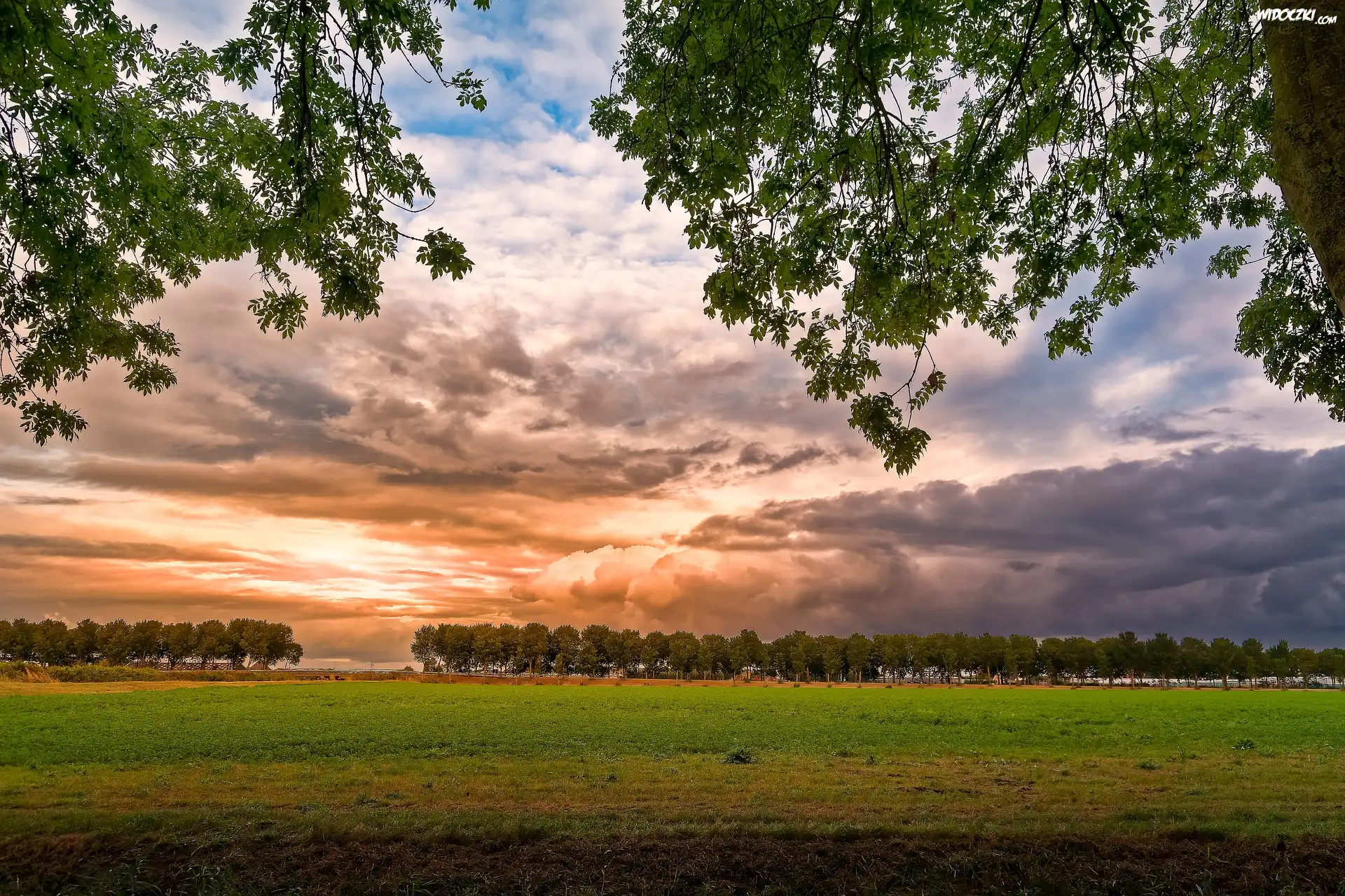 Zachód słońca, Chmury, Drzewa, Łąka, Gałęzie, Liście