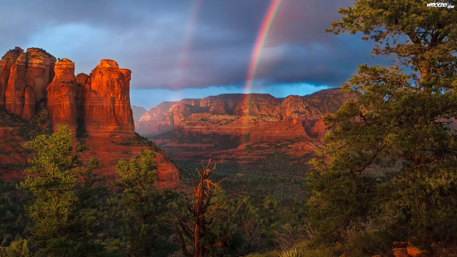 Stany Zjednoczone, Arizona, Sedona, Wilson Mountain, Góry, Skały, Szczyty, Drzewa, Tęcza, Chmury