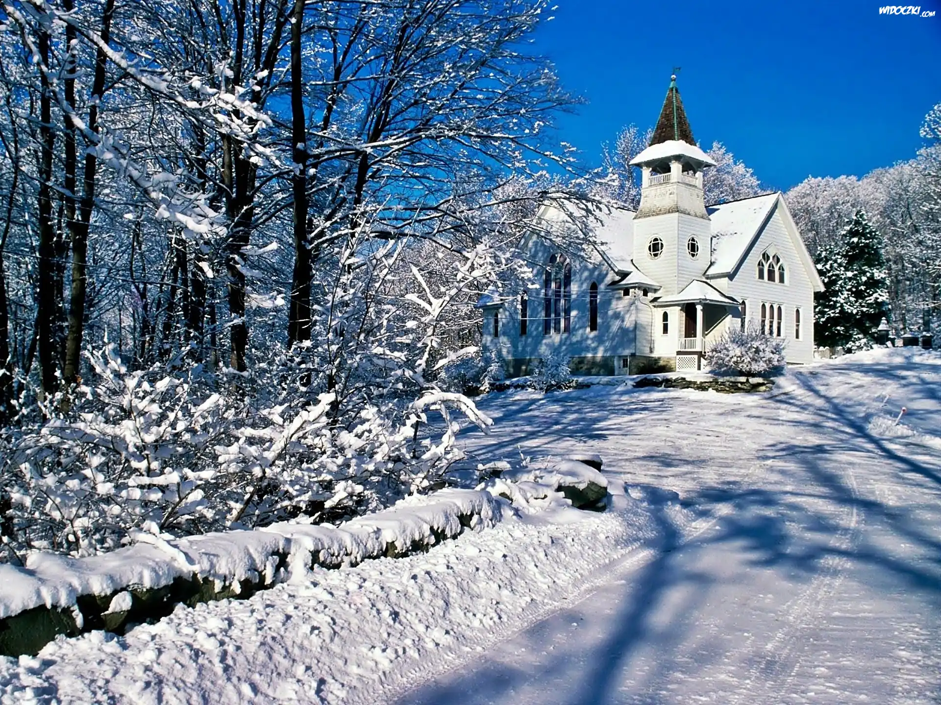 Zdjęcia, Zima, Drzewa, W Śniegu, Droga, Kościół, Światło, Cień