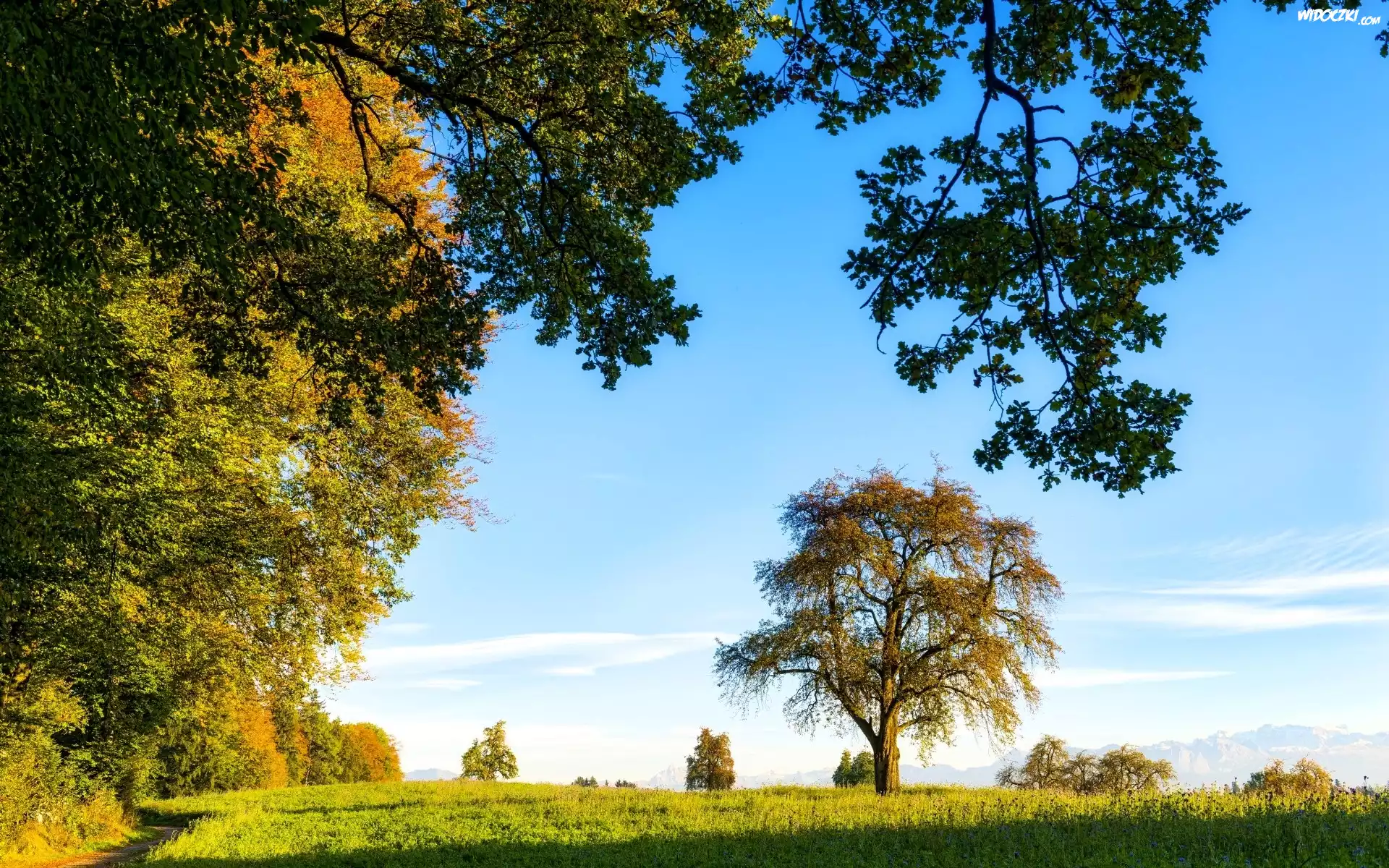 Zdjęcia, Łąka, Ścieżka, Drzewa, Niebo