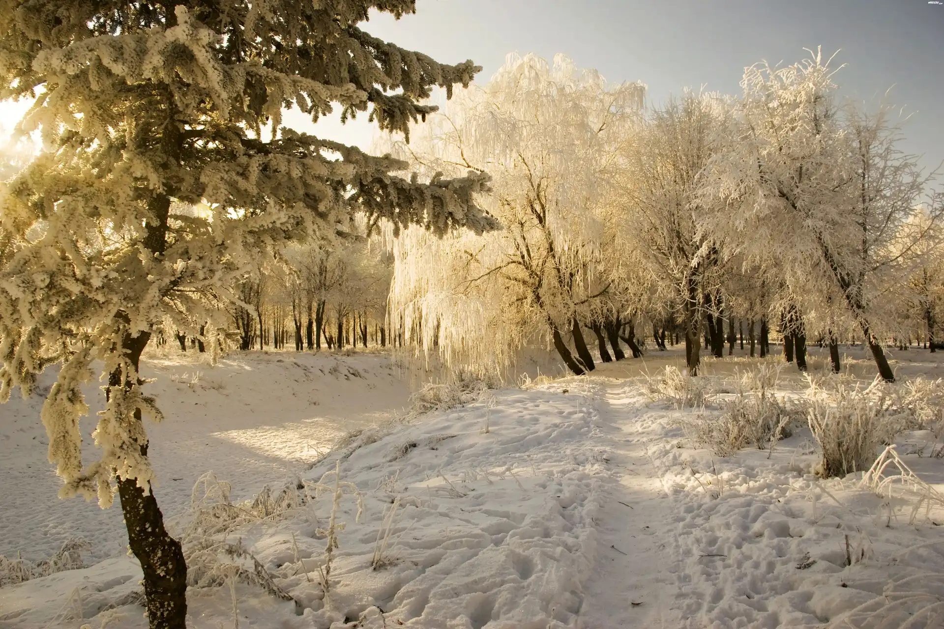 Drzewa, Śnieg, Ścieżka, Zima