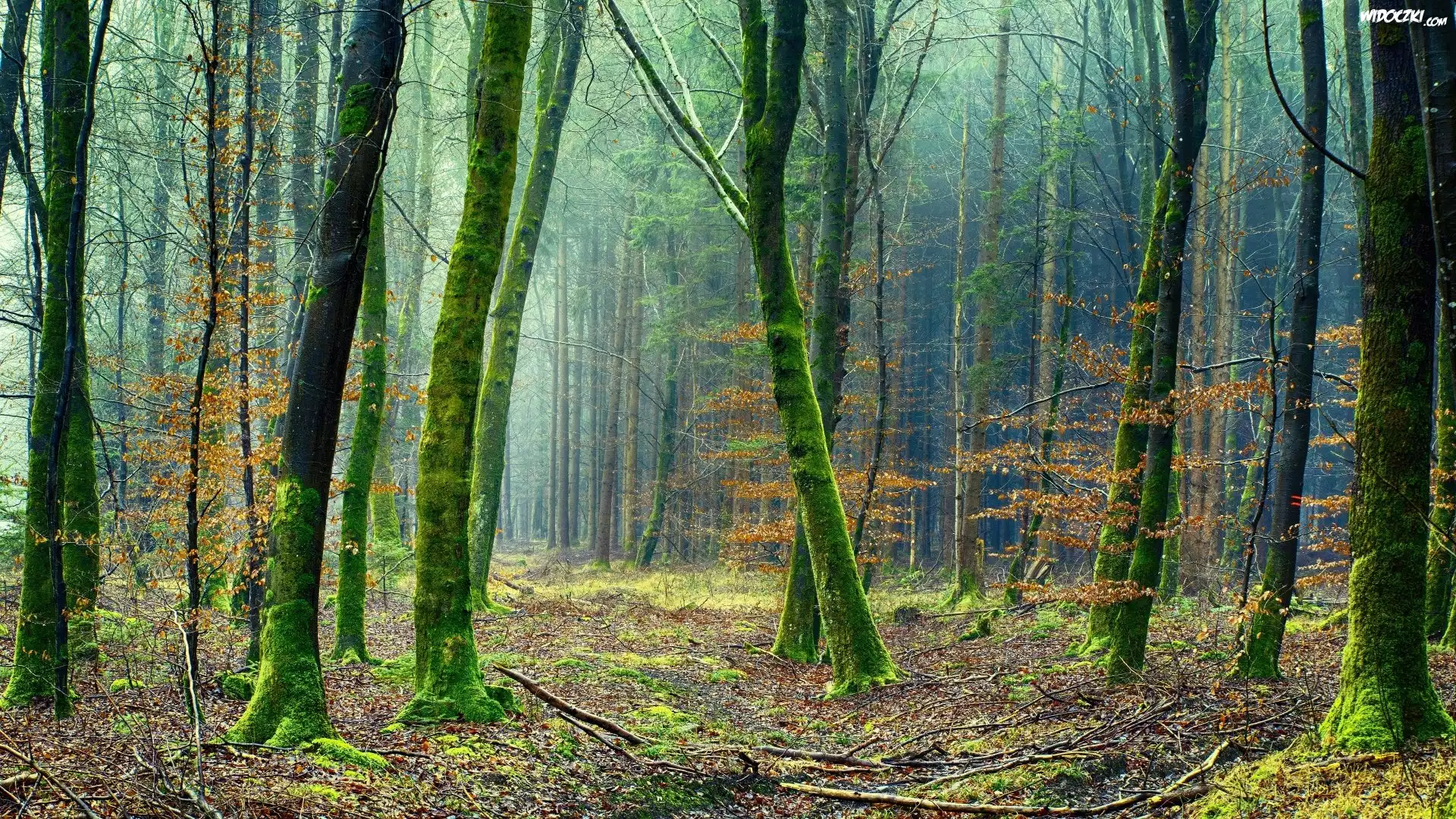 Zdjęcia, Drzewa, Omszone, Pnie, Las, Ściółka, Gałęzie