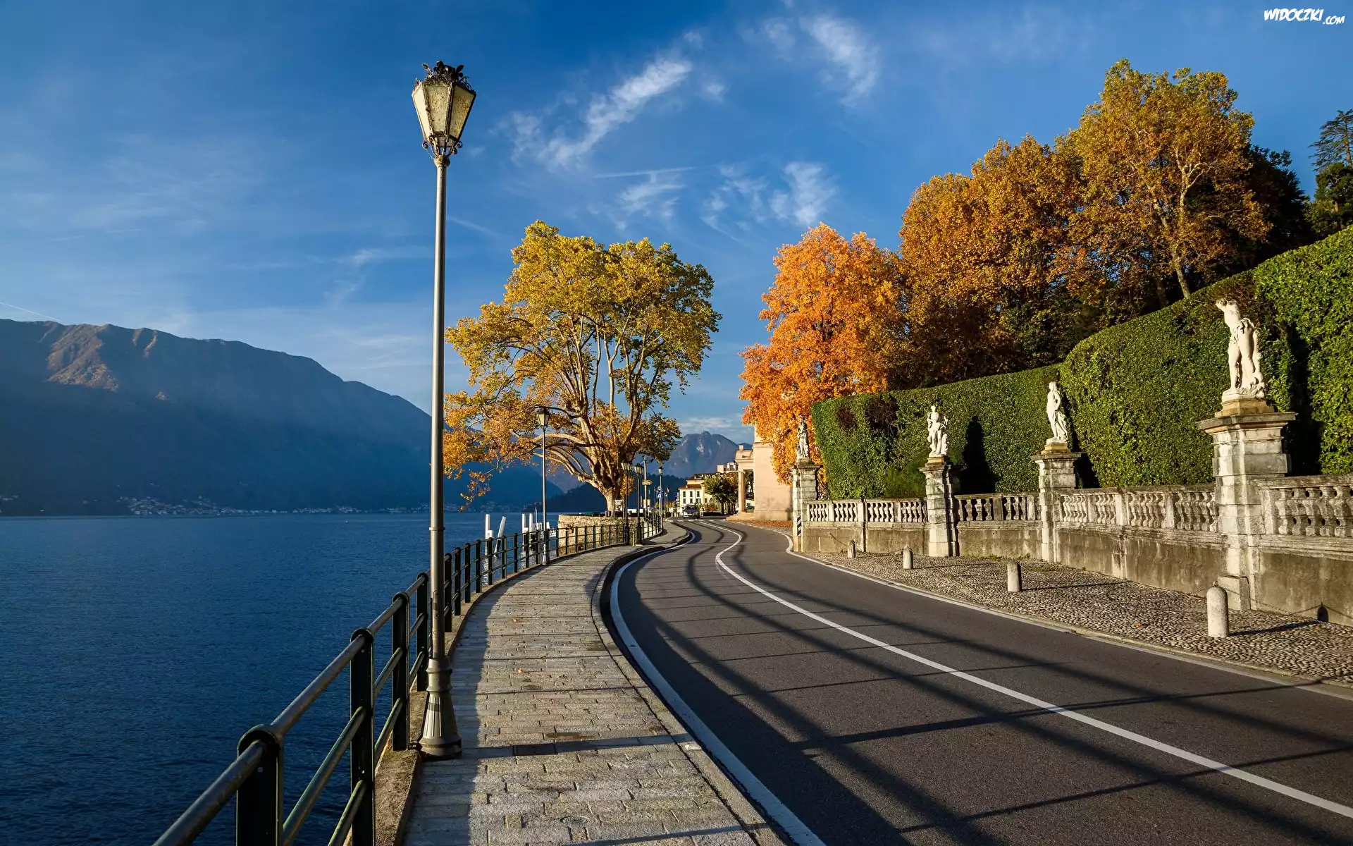 Zdjęcia, Włochy, Jezioro Como, Lago di Como, Droga, Latarnia, Jesień, Drzewa