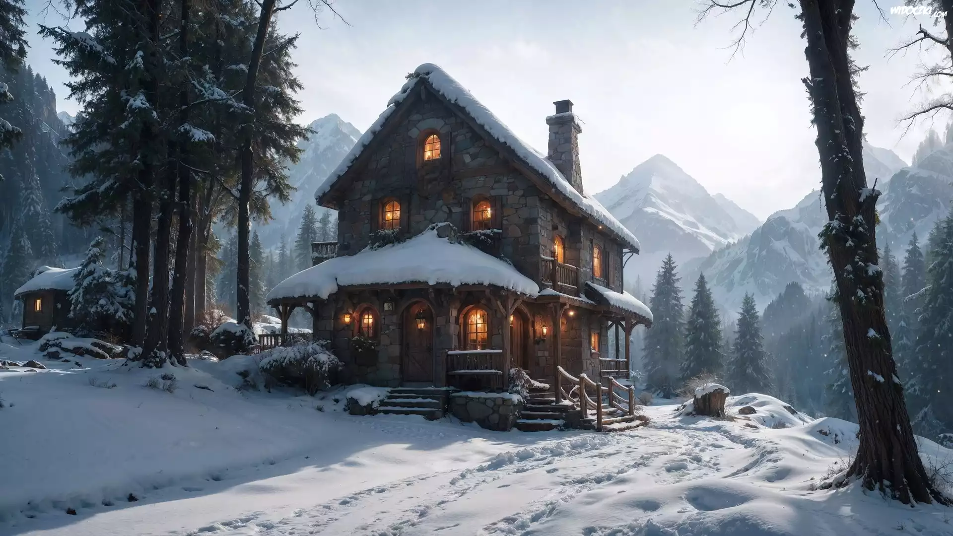 Zdjęcia, Dom, Zima, Góry, Drzewa