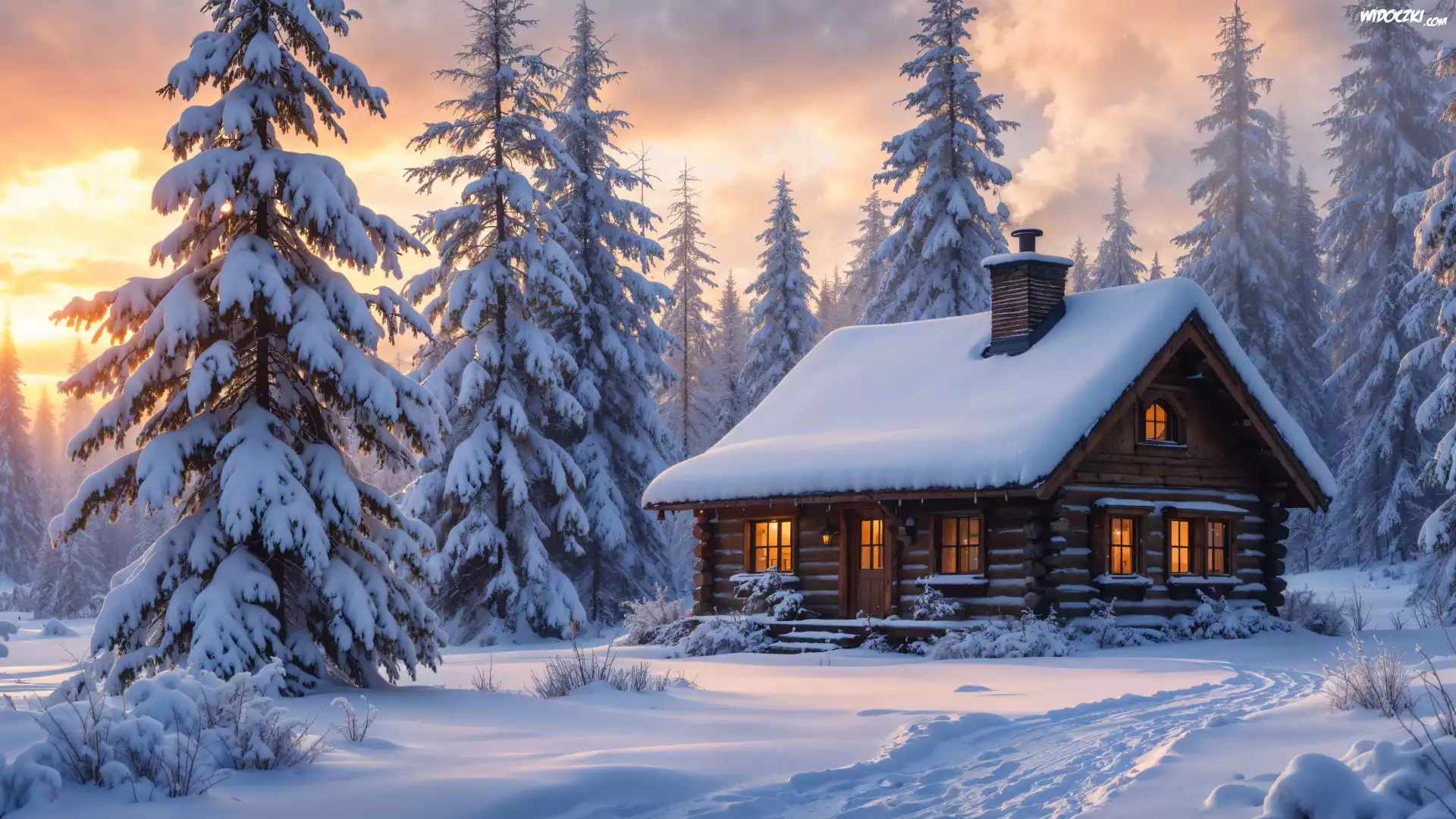 Zdjęcia, Zima, Las, Dom, Drzewa, Śnieg, Zachód słońca