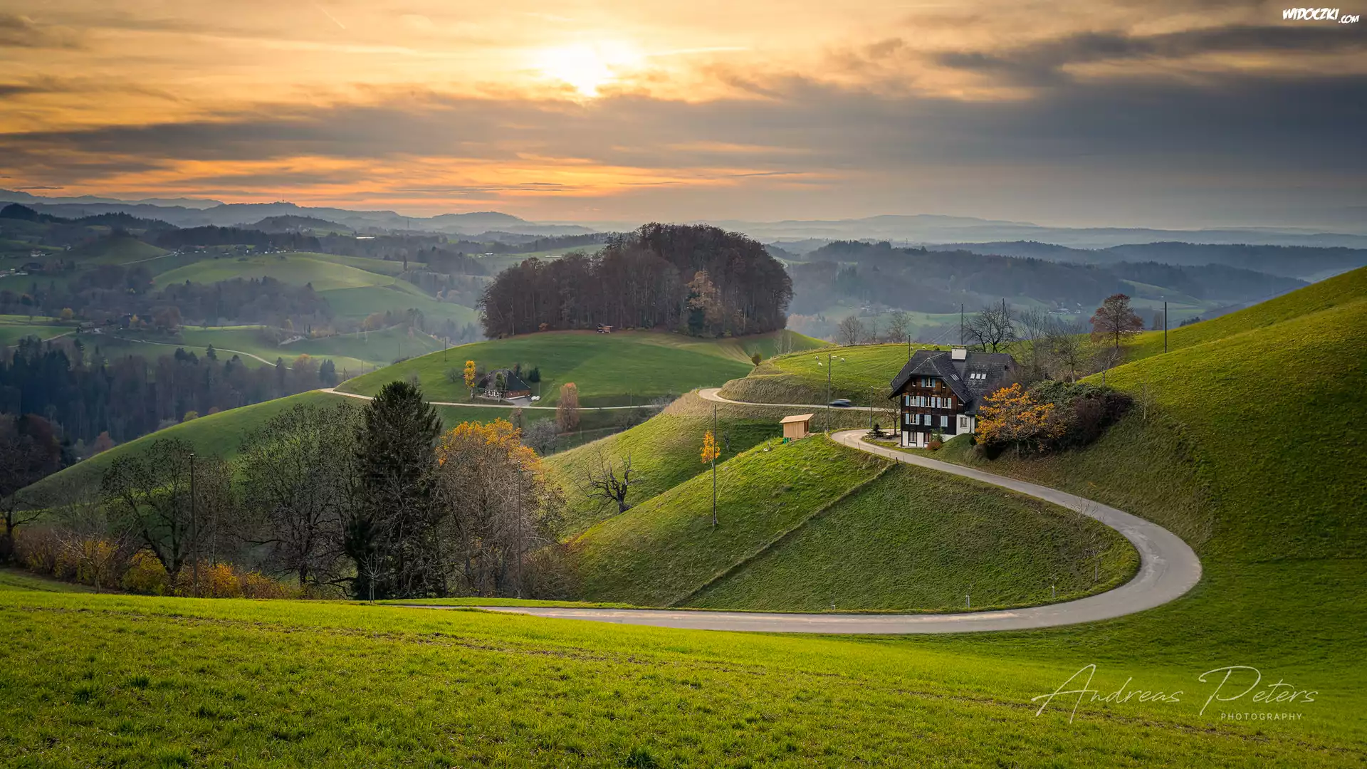 Zdjęcia, Wzgórza, Dom, Droga, Drzewa, Zachód słońca, Góry