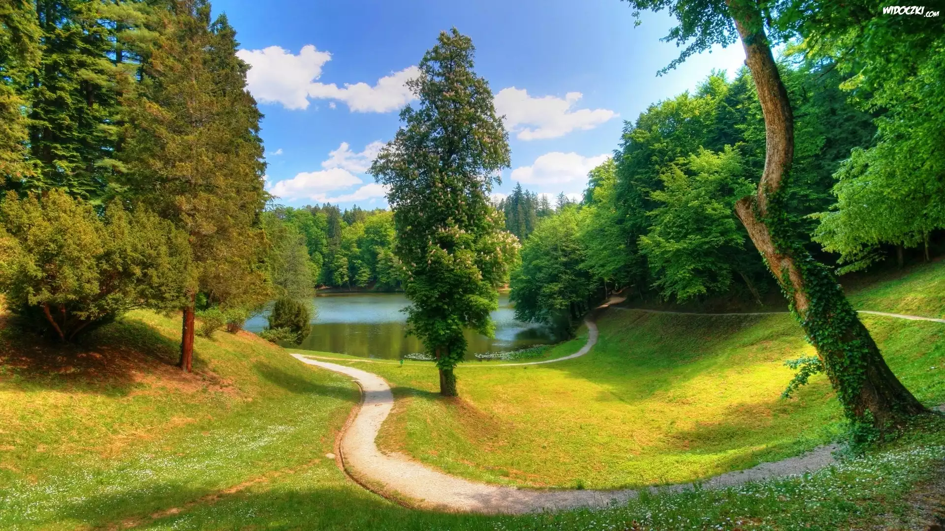 Zdj臋cia, Droga, Drzewa, Kwiaty
