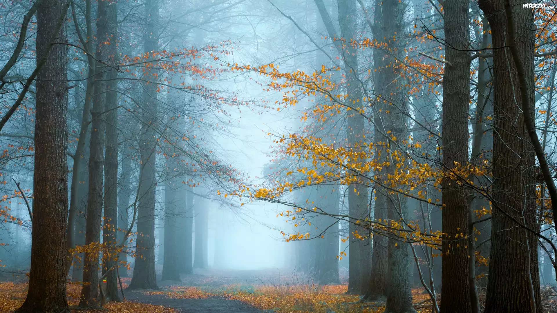 Las, Drzewa, Jesień, Mgła, Gałęzie, Pożółkłe, Liście, Droga