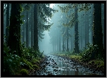 Zdjęcia, Las, Drzewa, Droga, Kałuże, Mgła