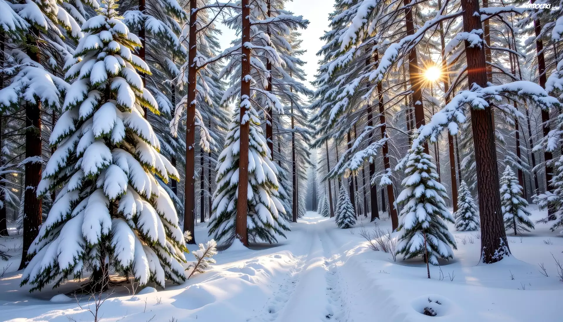 Zdjęcia, Zima, Zaśnieżona, Droga, Drzewa, Las, Grafika AI