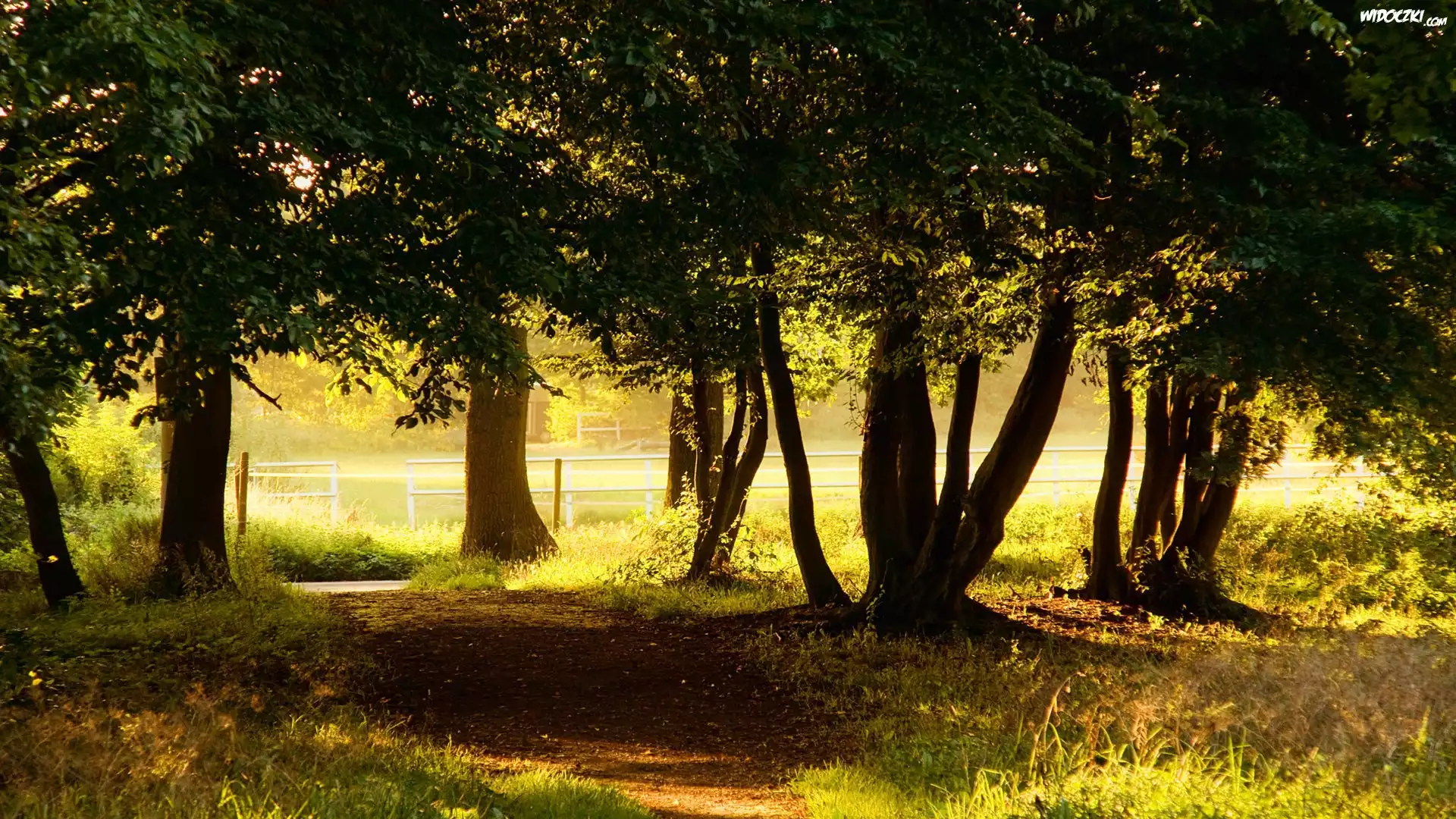 Zdjęcia, Dróżka, Drzewa, Ogrodzenie