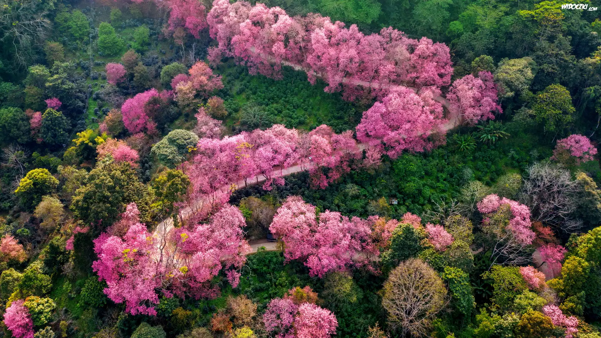 Zdjęcia, Drzewa, Alejka, Park, Wiosna, Kwitnące, Drzewa owocowe, Wiśnie japońskie, Z lotu ptaka