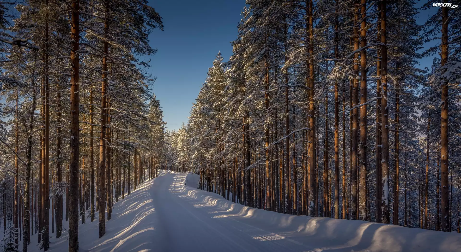 Finlandia, Prowincja Finlandia Wschodnia, Lieksa, Zima, Las, Droga, Drzewa