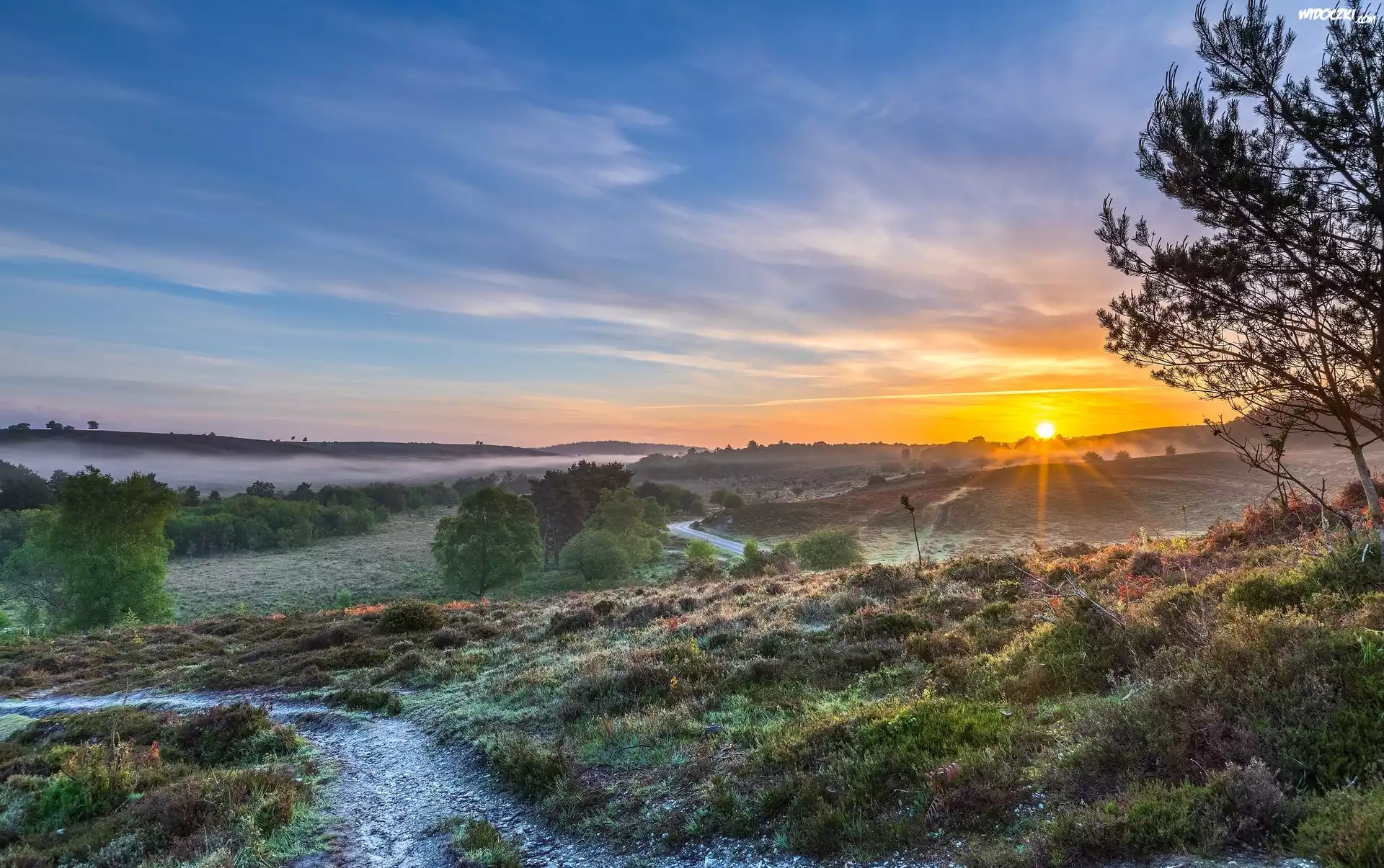 Anglia, Park Narodowy New Forest, Wzgórza, Mgła, Wschód słońca, Drzewa