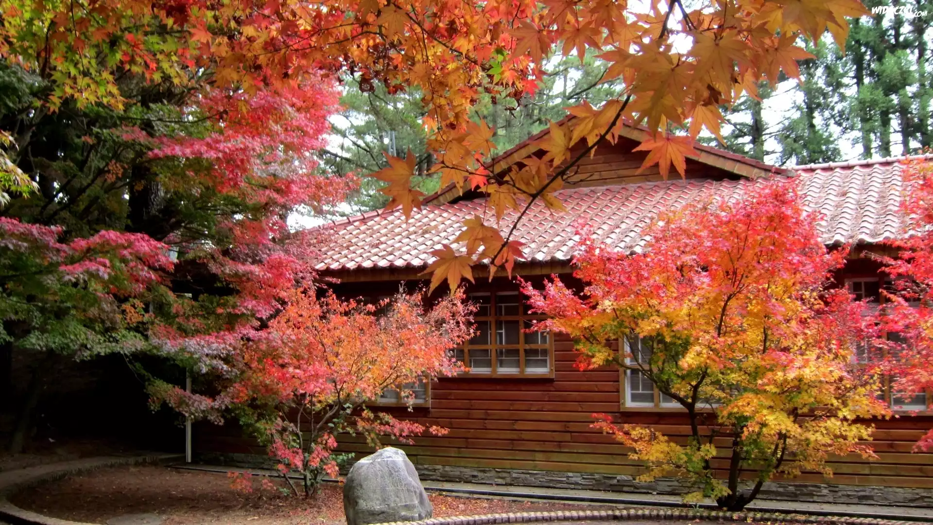 Zdjęcia, Drzewa, Kolorowe, Liście, Głaz, Domek