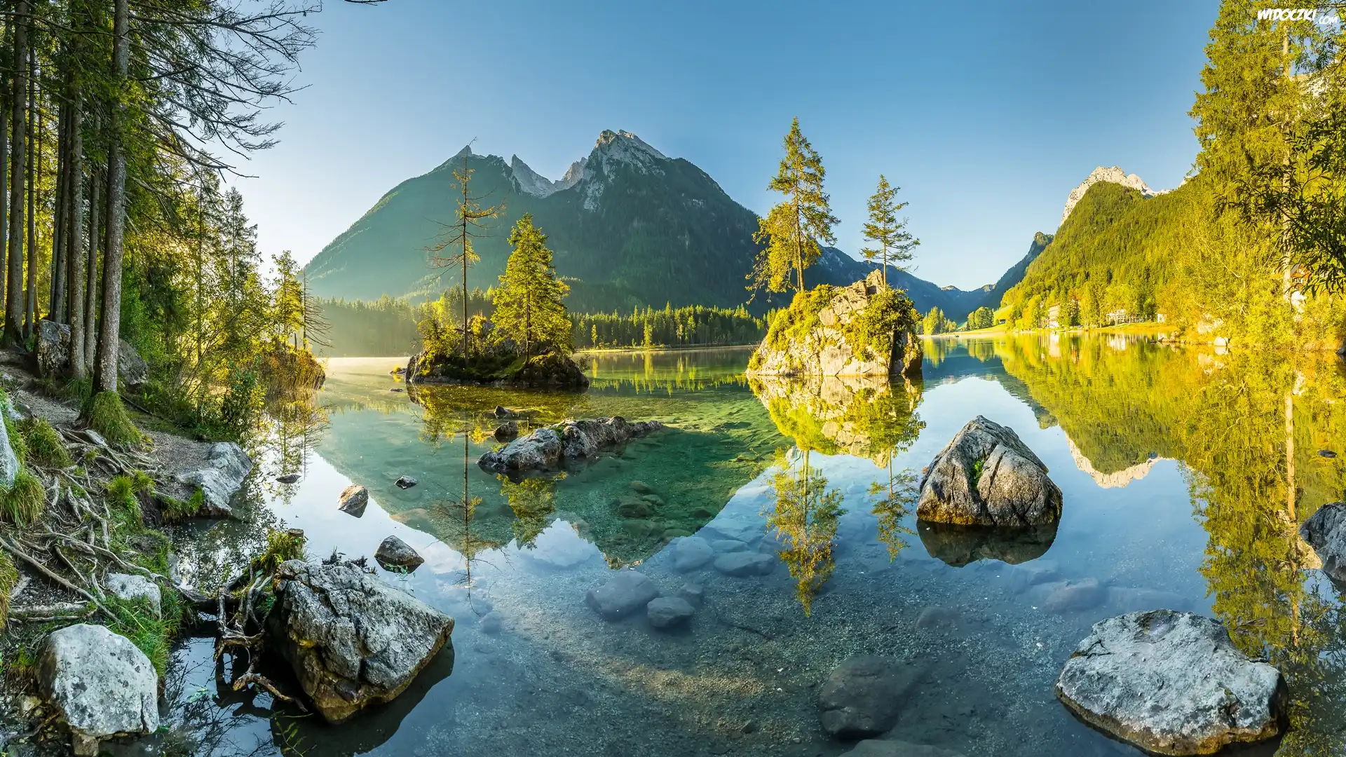 Zdjęcia, Niemcy, Bawaria, Góry Alpy, Jezioro Hintersee, Skały, Kamienie, Drzewa