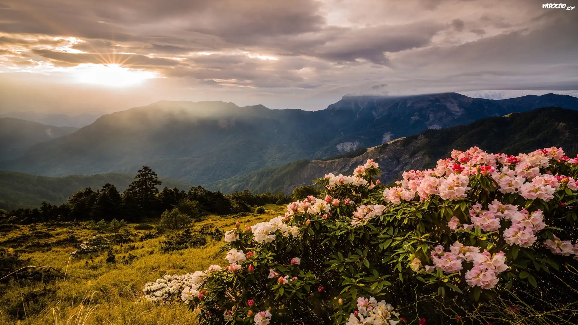 Góry, Drzewa, Kwiaty, Różanecznik, Wschód słońca, Chmury