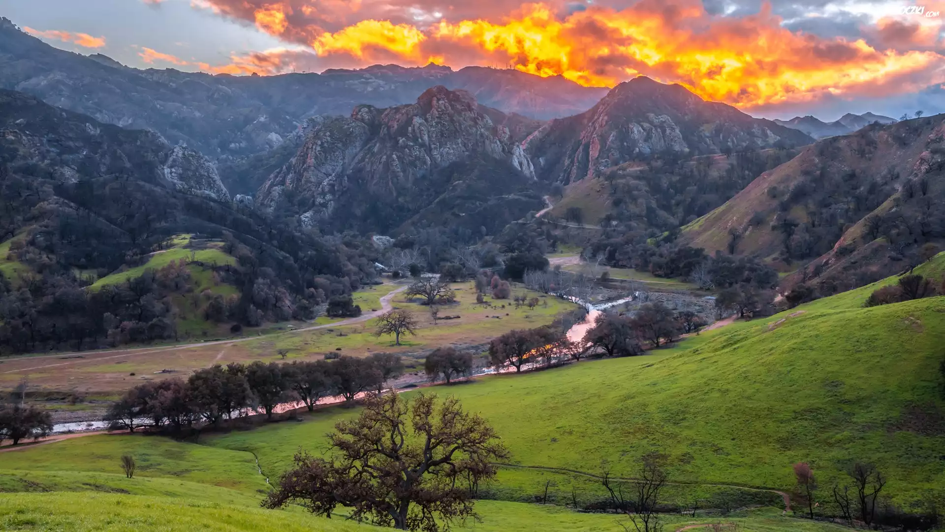 Zdjęcia, Góry, Drzewa, Dolina, Rzeka, Zachód słońca, Chmury