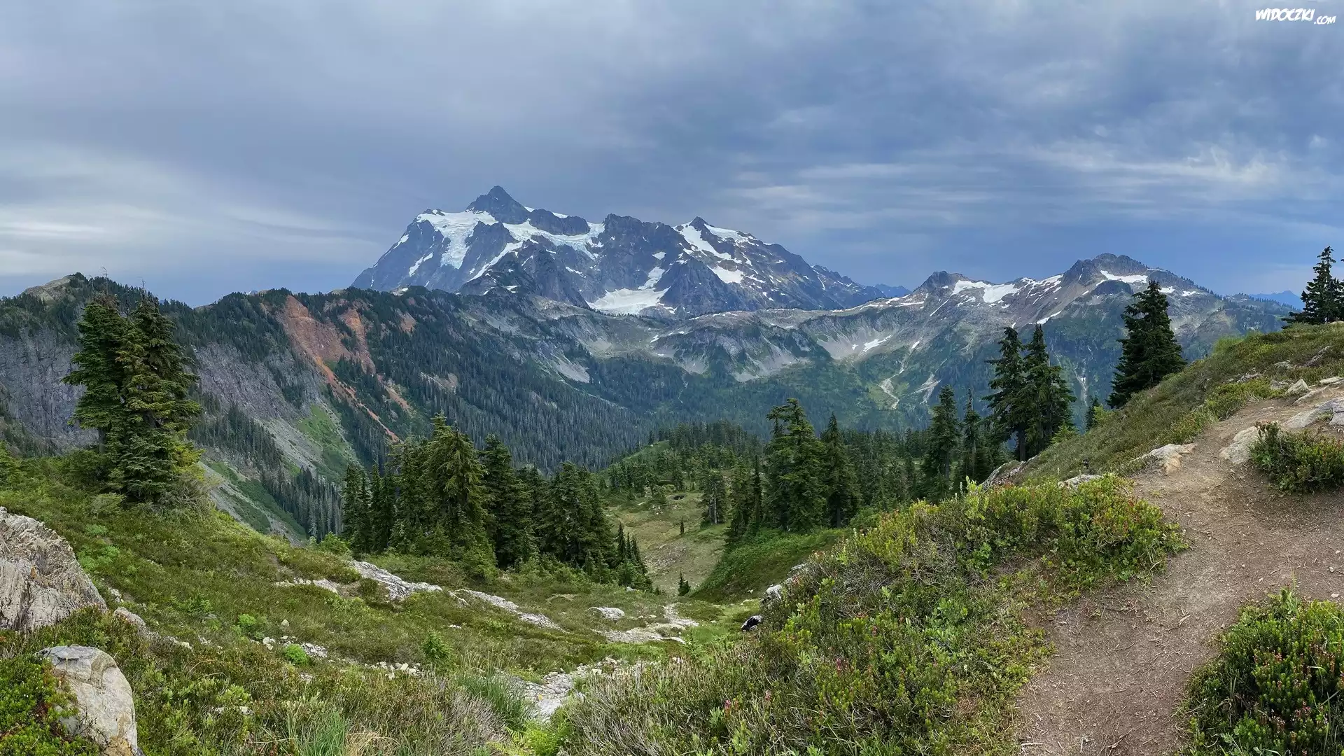 Stany Zjednoczone, Stan Waszyngton, Góry Mount Shuksan, Las, Drzewa, Park Narodowy Północnych Gór Kaskadowych |