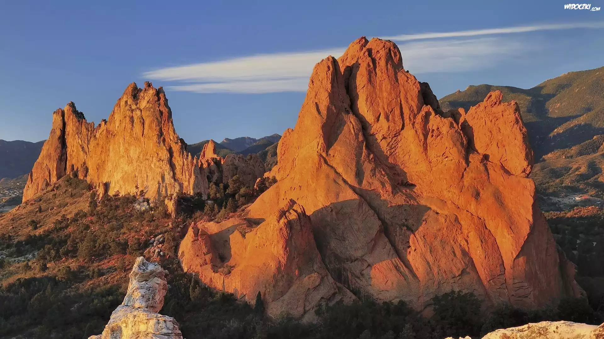 Zdjęcia, Góry, Pomarańczowe, Skały, Drzewa