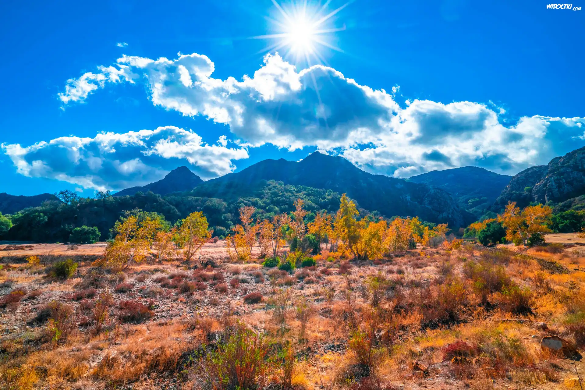 Góry, Drzewa, Trawa, Jesień, Chmury, Promienie słońca