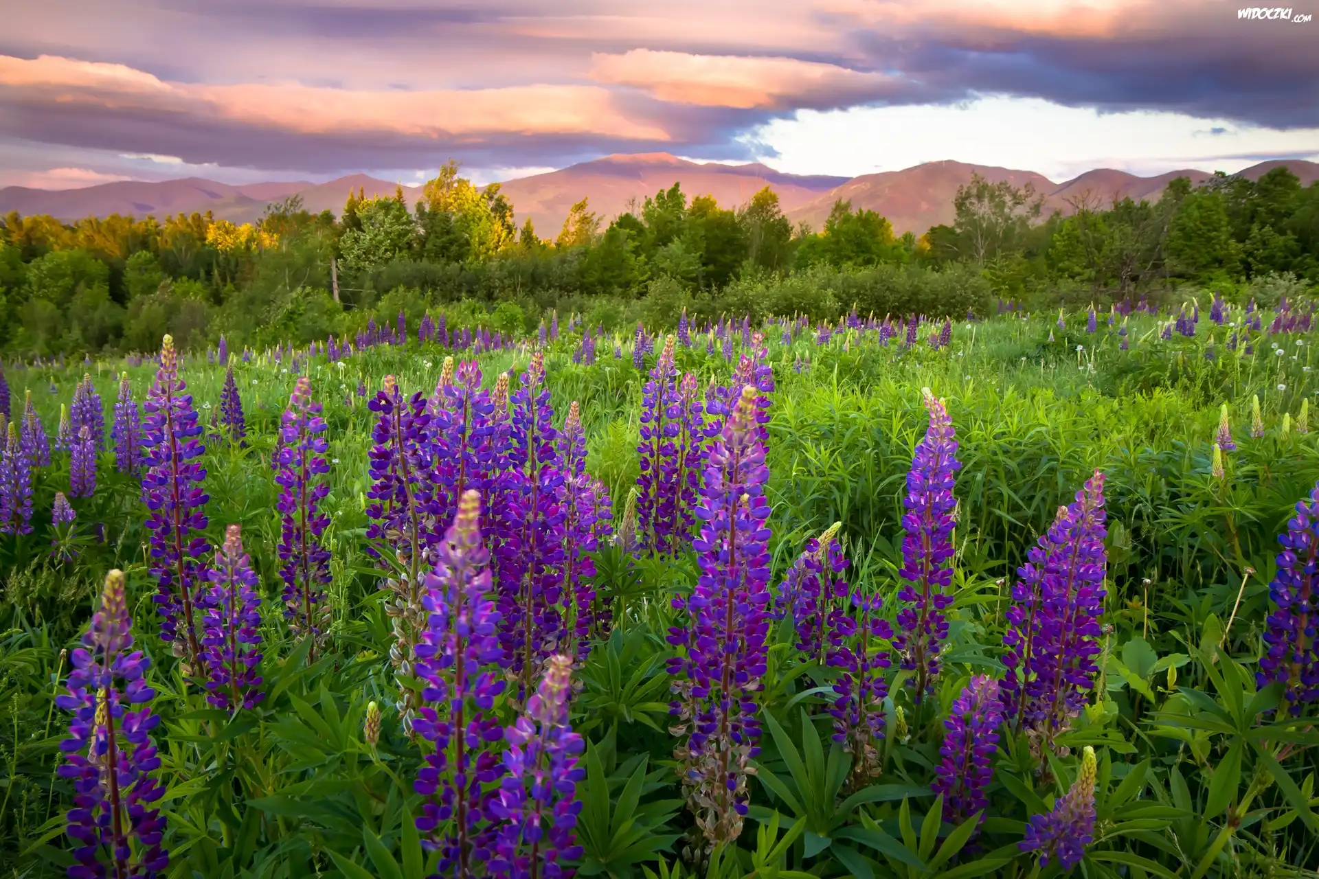Łubin, Góry, Drzewa, Niebo