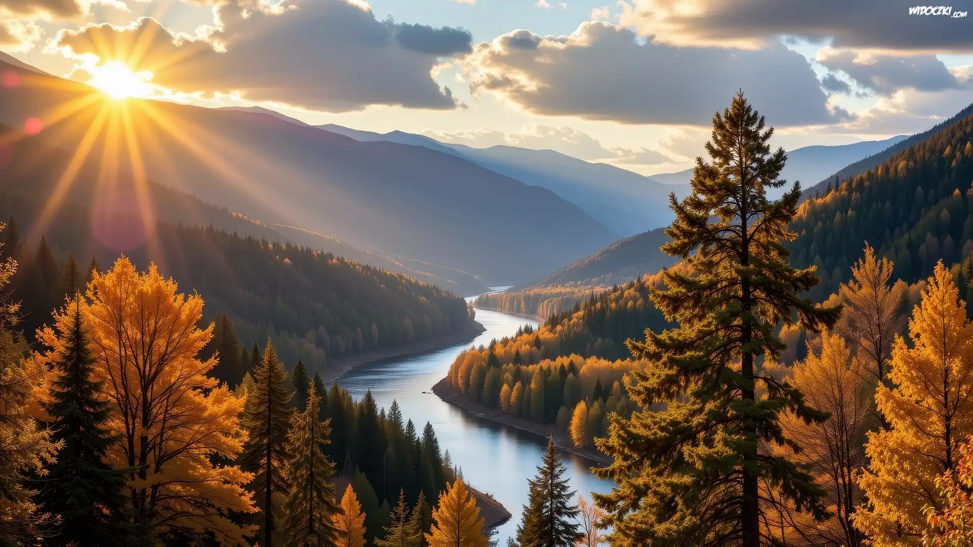 Zdjęcia, Jesień, Zalesione, Góry, Rzeka, Promienie słońca, Żółte, Drzewa