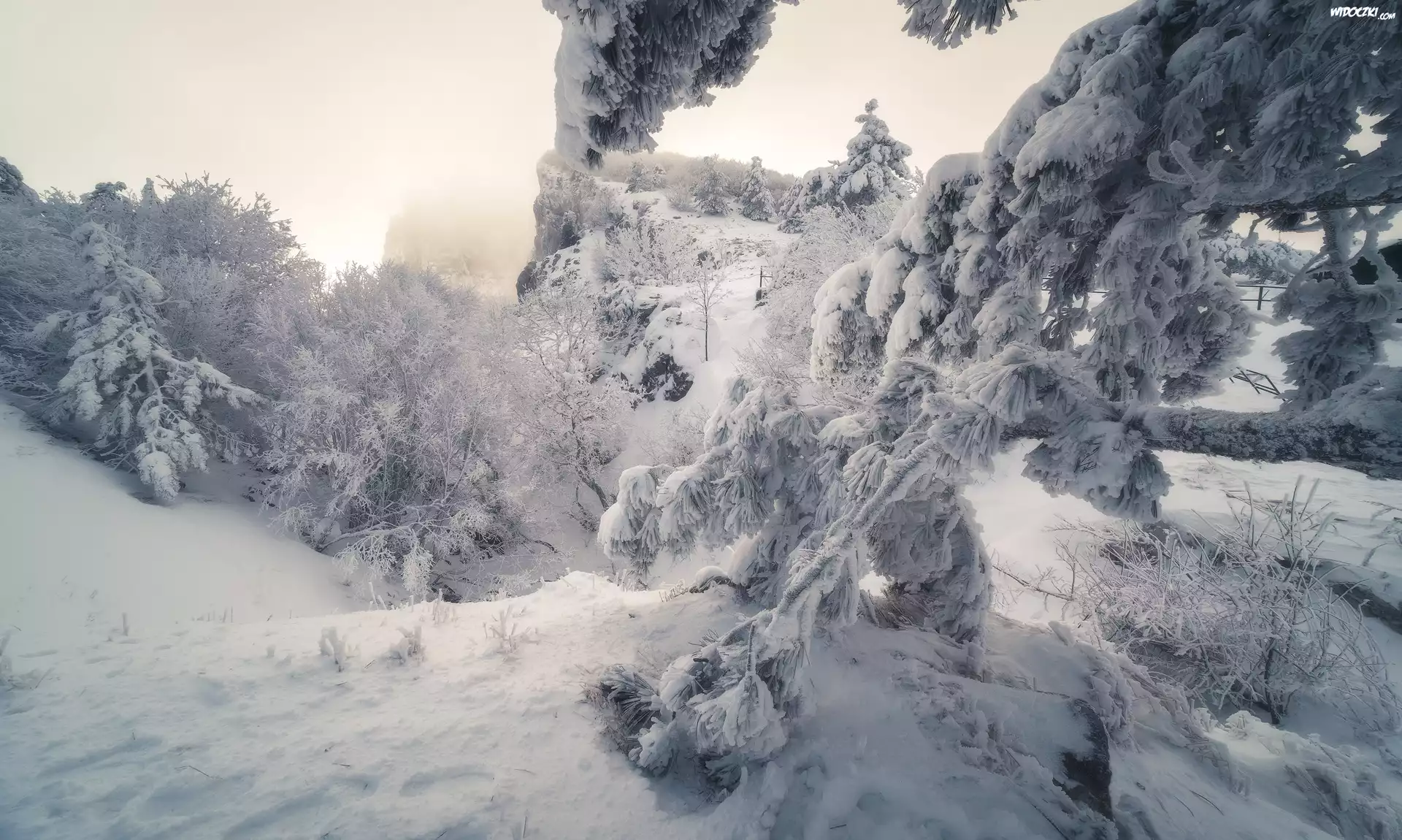 Zima, Zaśnieżone, Drzewa, Gałęzie, Góry Krymskie, Śnieg, Szczyt Aj-Petri, Krym