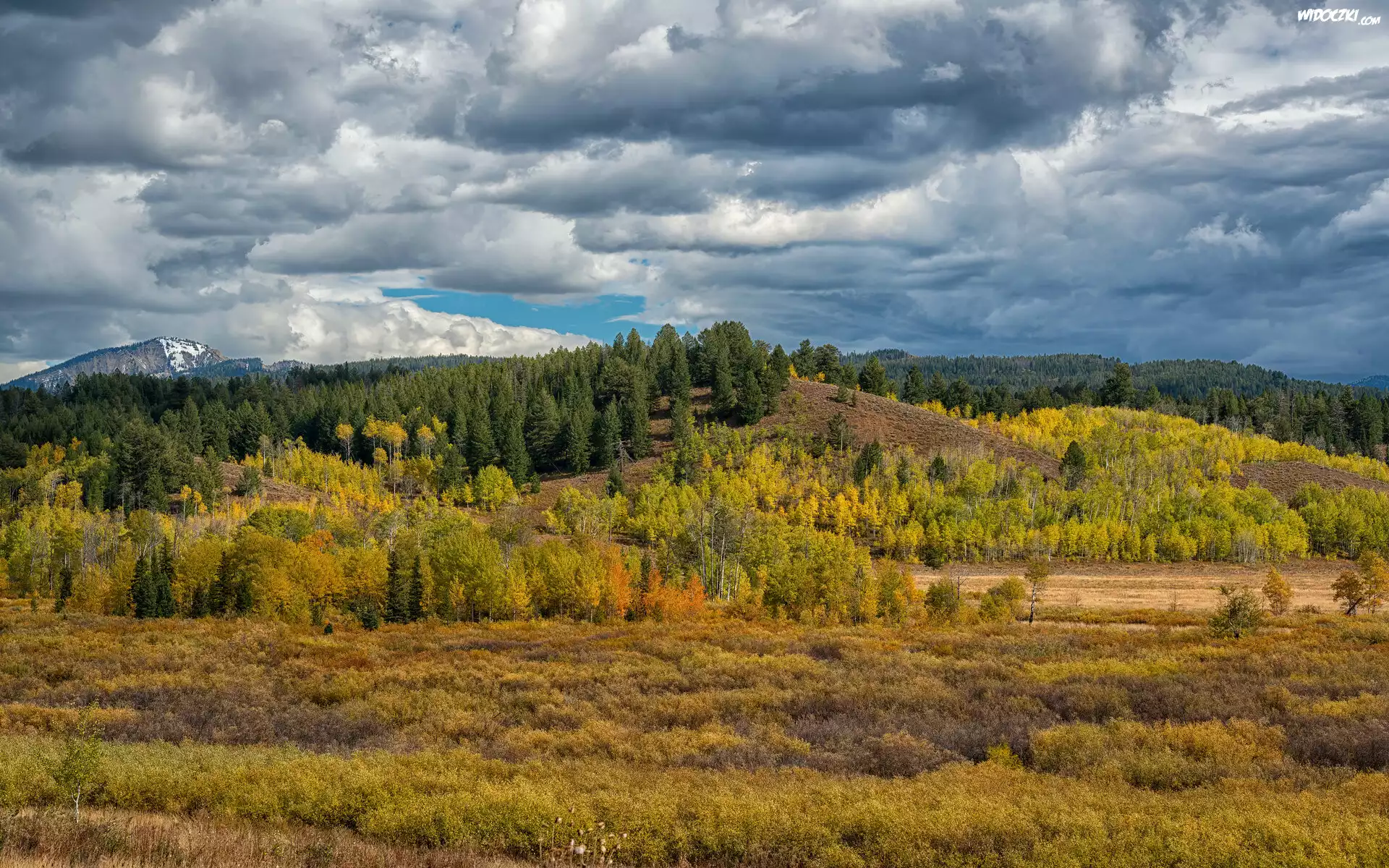 Park Narodowy Grand Teton, Góry, Teton Range, Pole, Drzewa, Chmury, Stan Wyoming, Stany Zjednoczone